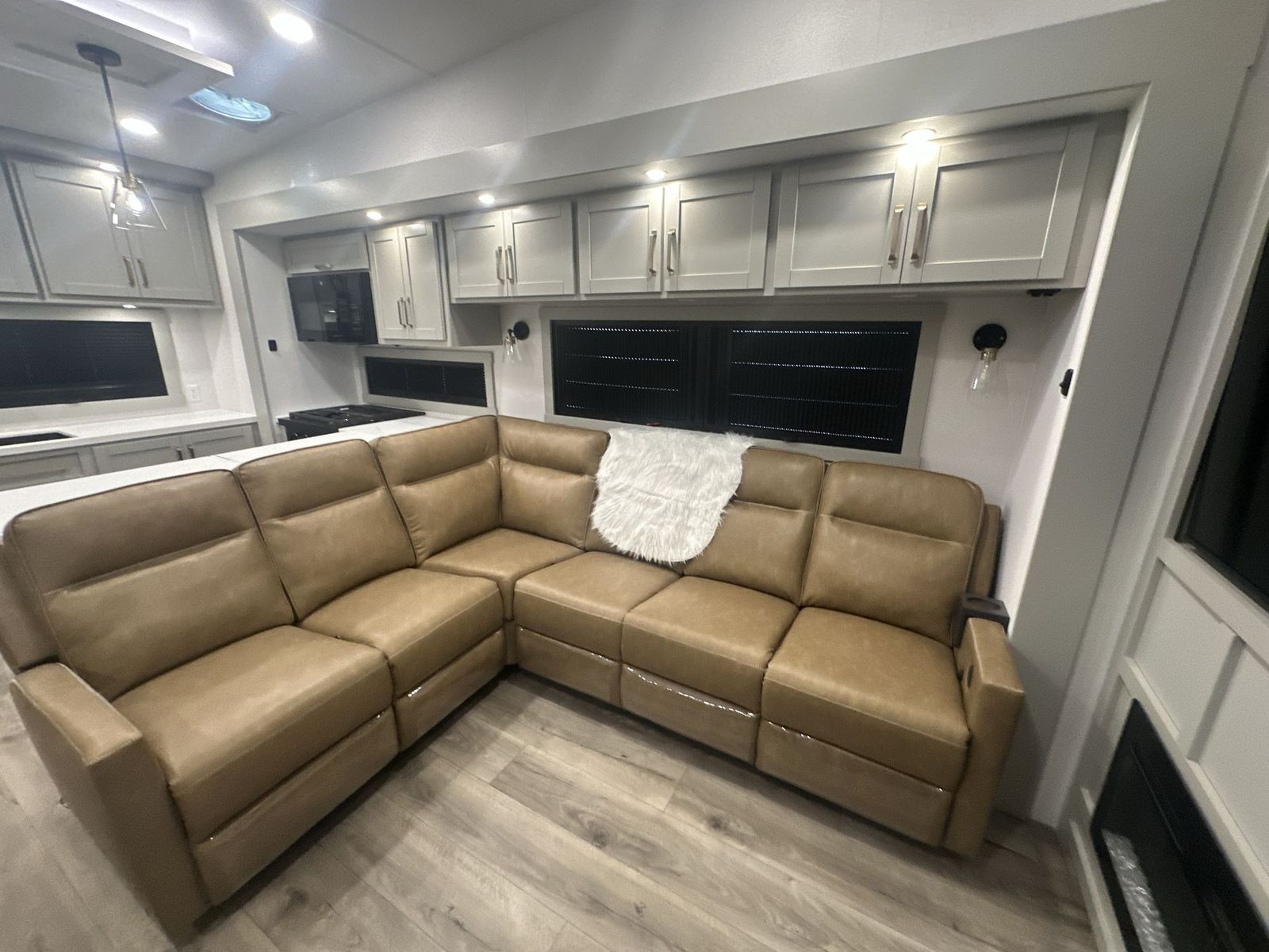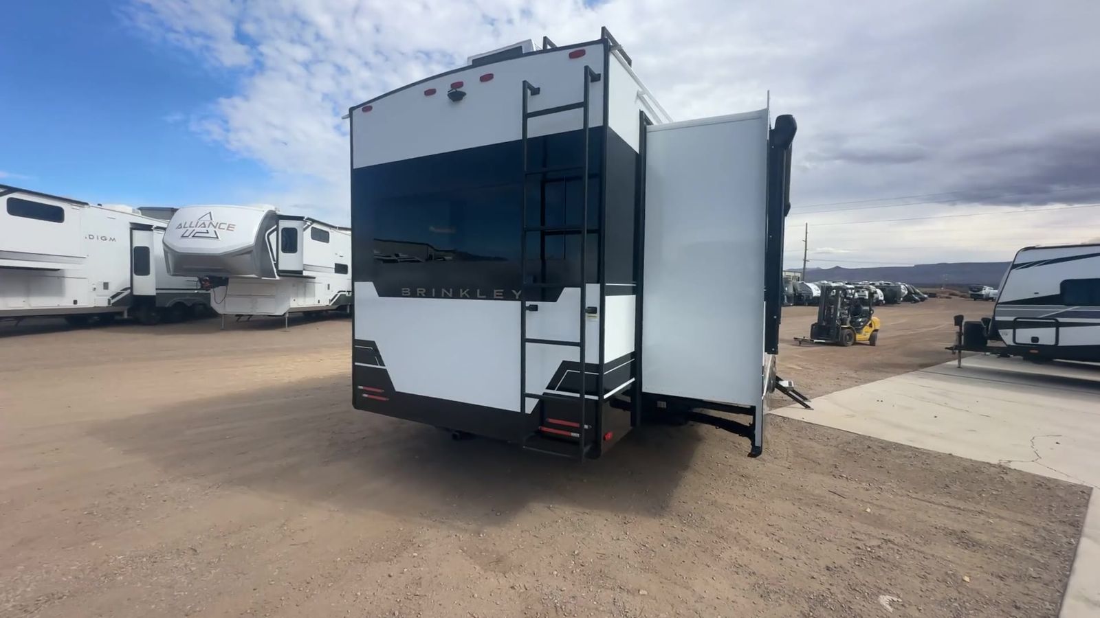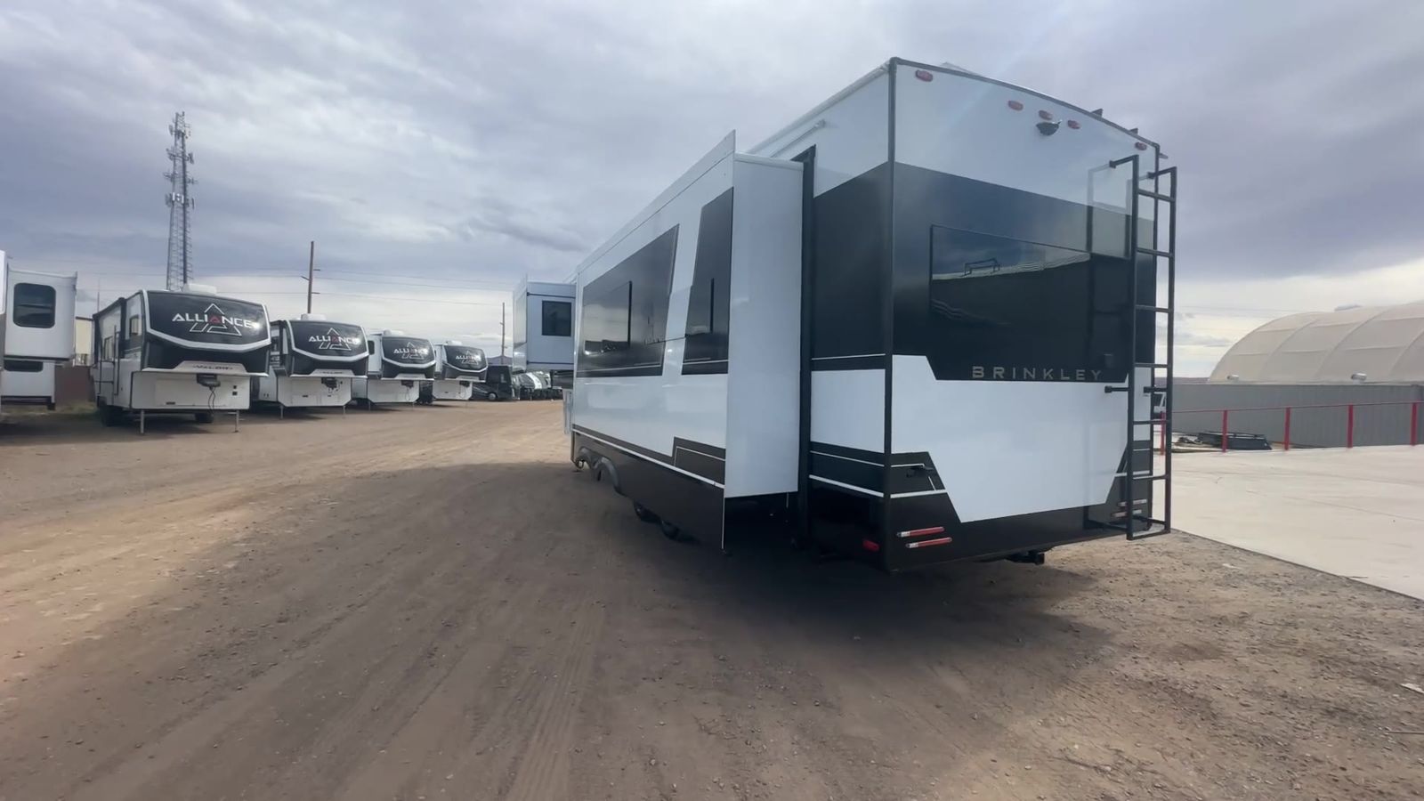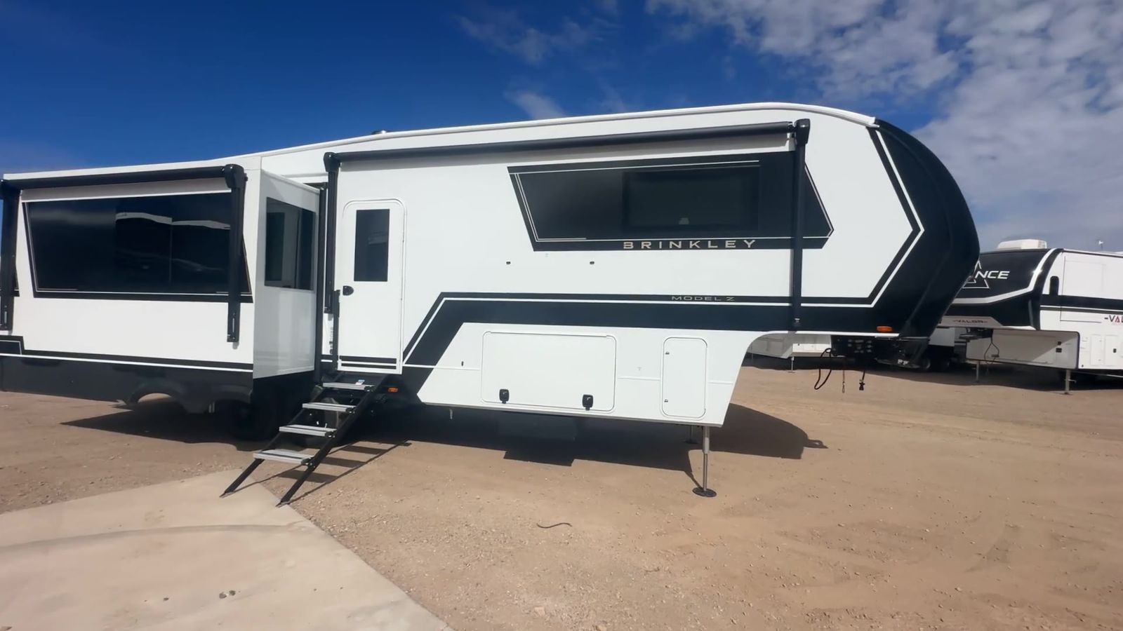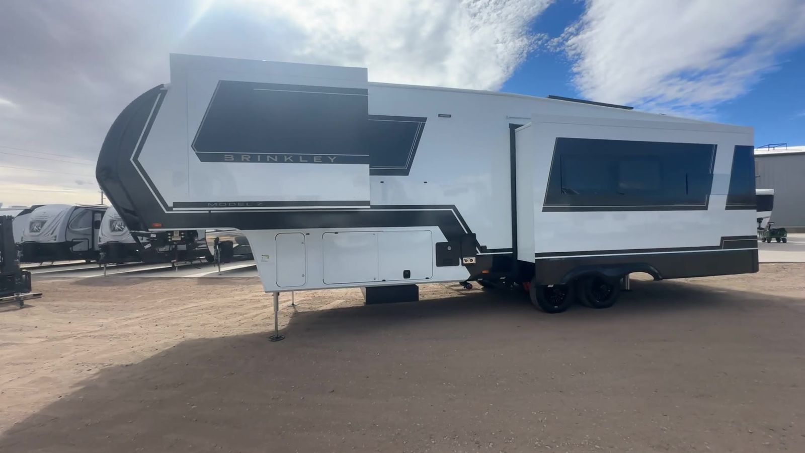 Brinkley Model Z 3200 fifth wheel highlights: L-Sofa with Five Recliners Flip-Up Countertop Fireplace Dual Awnings Shoe Storage Escape to a world of comfort and luxury with this incredible fifth wheel! The living area features a plush L-sofa, five recliners, and a warm fireplace. The versatile dining table/L desk seats up to four people, making it perfect for meals, work, or play. Ample shoe storage and a convenient spot for pet bowls enhance comfort and practicality. The kitchen offers stunning solid surface countertops, dishwasher prep, a residential microwave, and a three-burner cooktop. The expansive pantry with pull-out drawers provides ample storage for your favorite ingredients and cooking essentials. The full bathroom is a serene oasis, featuring a linen closet for added storage and convenience. The front bedroom is a peaceful sanctuary, featuring a spacious king bed, shelves, and a sliding dresser top with hidden storage. The generous wardrobe and shoe rack provide ample storage for your clothes and shoes. The Brinkley mid-profile Model Z fifth wheels bring you clean lines and an upscale look with plenty of style and exciting new features like the industry first brass plumbing connections. These units also feature an automotive grade front cap, plenty of exterior storage, exterior hot and cold showers, and wide stance leveling jacks for easy set up.Residential frameless windows provide a clean look and beautiful views, and ample electrical outlets and 6 USB/USB-C outlets allow all of your electronics and appliances to easily be used and charged.