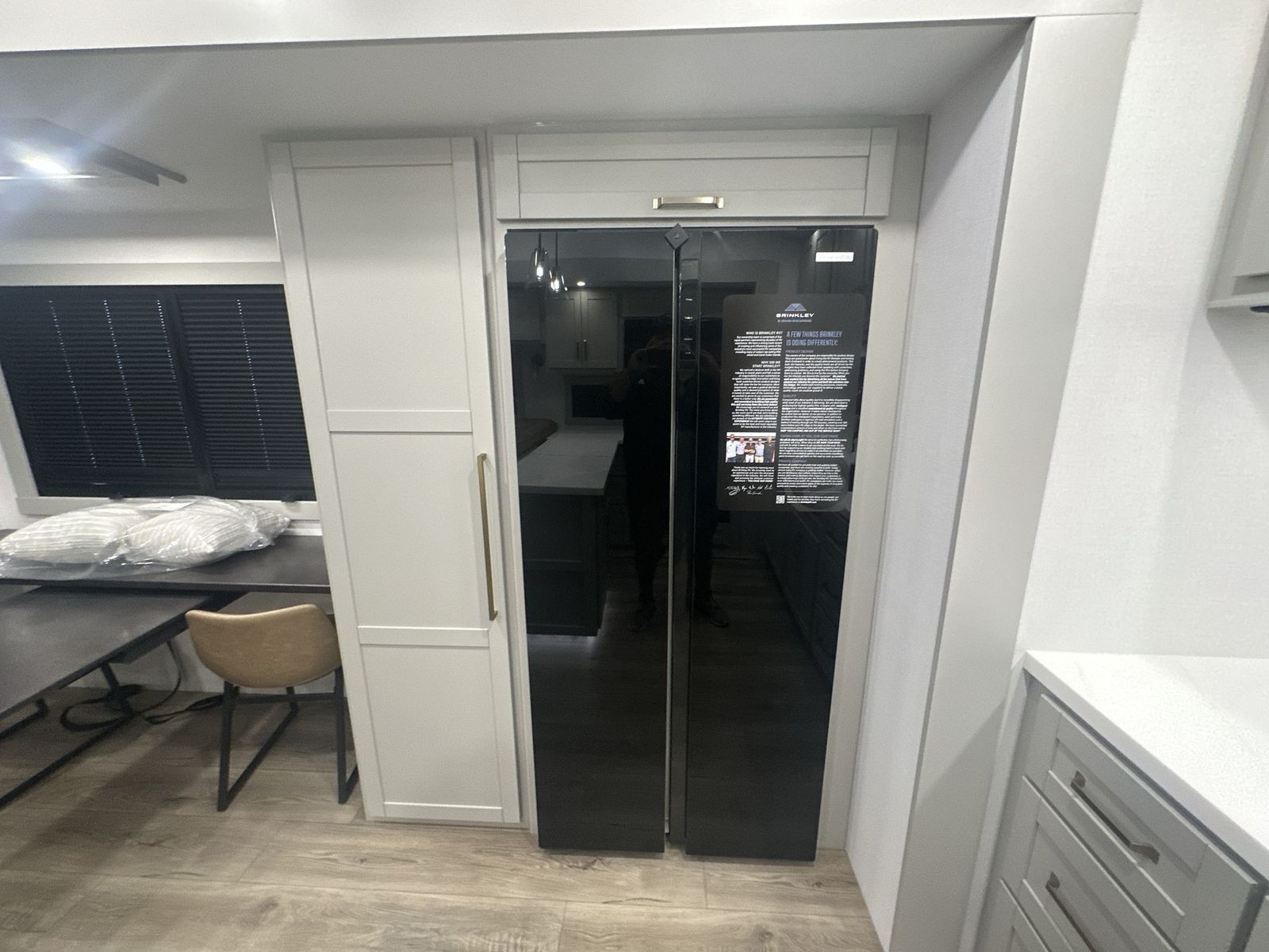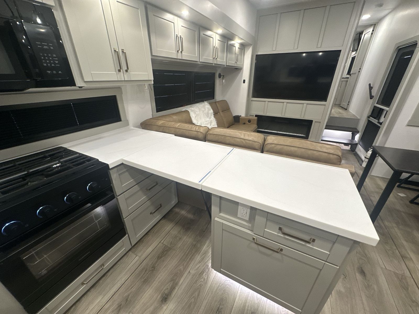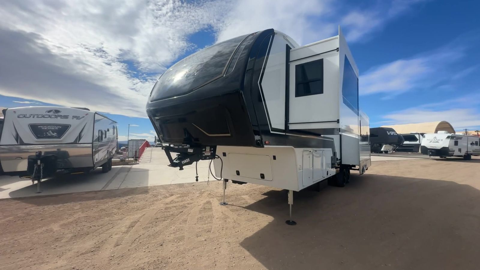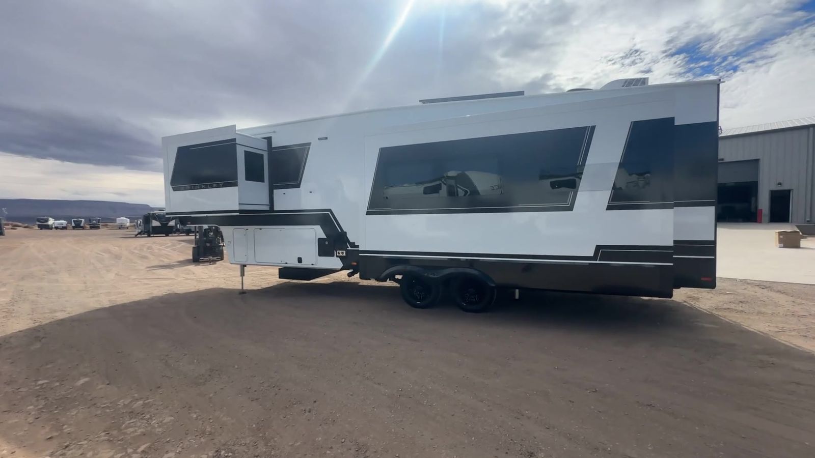 Brinkley Model Z 3200 fifth wheel highlights: L-Sofa with Five Recliners Flip-Up Countertop Fireplace Dual Awnings Shoe Storage Escape to a world of comfort and luxury with this incredible fifth wheel! The living area features a plush L-sofa, five recliners, and a warm fireplace. The versatile dining table/L desk seats up to four people, making it perfect for meals, work, or play. Ample shoe storage and a convenient spot for pet bowls enhance comfort and practicality. The kitchen offers stunning solid surface countertops, dishwasher prep, a residential microwave, and a three-burner cooktop. The expansive pantry with pull-out drawers provides ample storage for your favorite ingredients and cooking essentials. The full bathroom is a serene oasis, featuring a linen closet for added storage and convenience. The front bedroom is a peaceful sanctuary, featuring a spacious king bed, shelves, and a sliding dresser top with hidden storage. The generous wardrobe and shoe rack provide ample storage for your clothes and shoes. The Brinkley mid-profile Model Z fifth wheels bring you clean lines and an upscale look with plenty of style and exciting new features like the industry first brass plumbing connections. These units also feature an automotive grade front cap, plenty of exterior storage, exterior hot and cold showers, and wide stance leveling jacks for easy set up.Residential frameless windows provide a clean look and beautiful views, and ample electrical outlets and 6 USB/USB-C outlets allow all of your electronics and appliances to easily be used and charged.