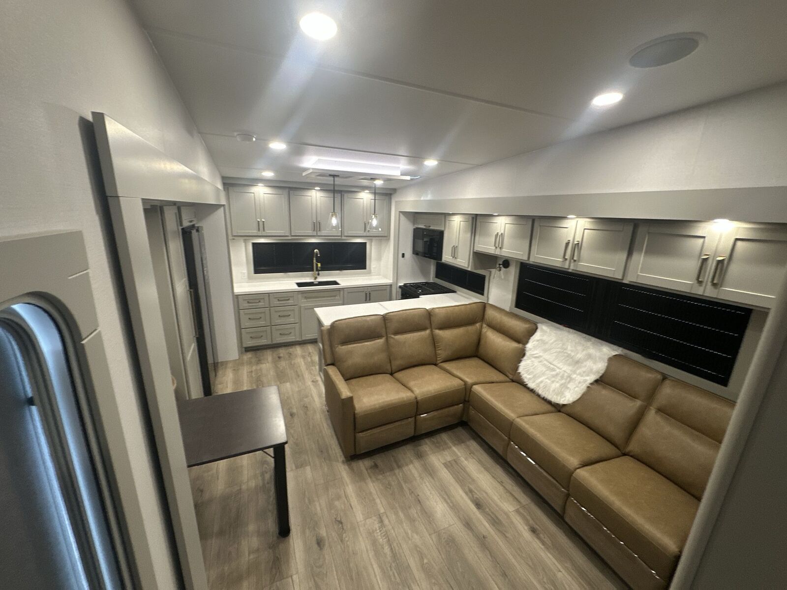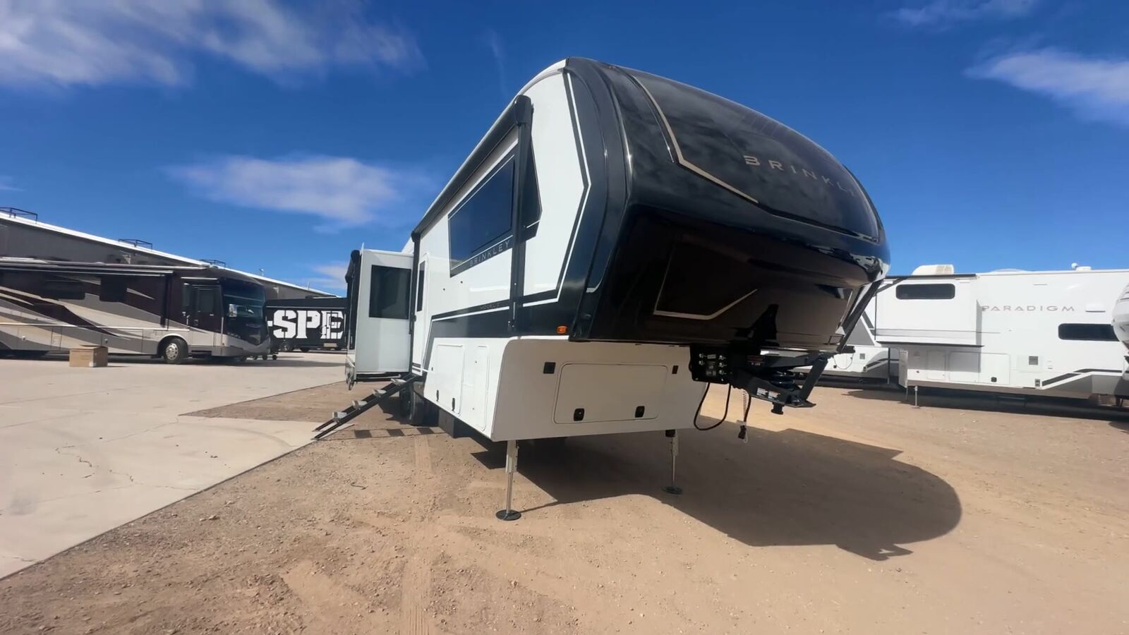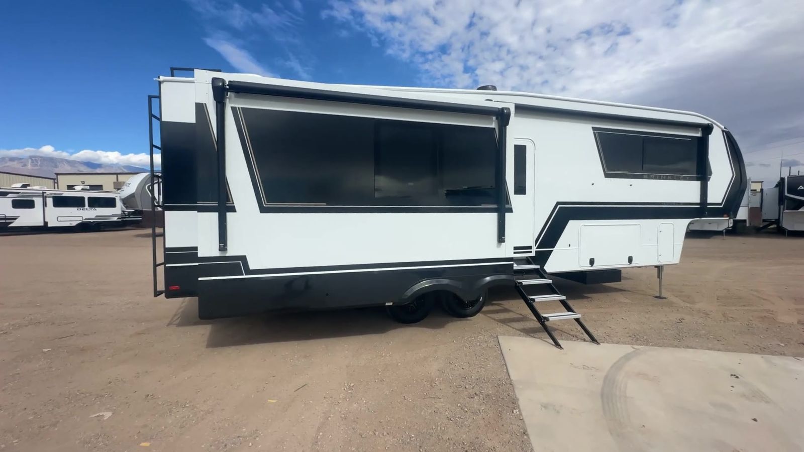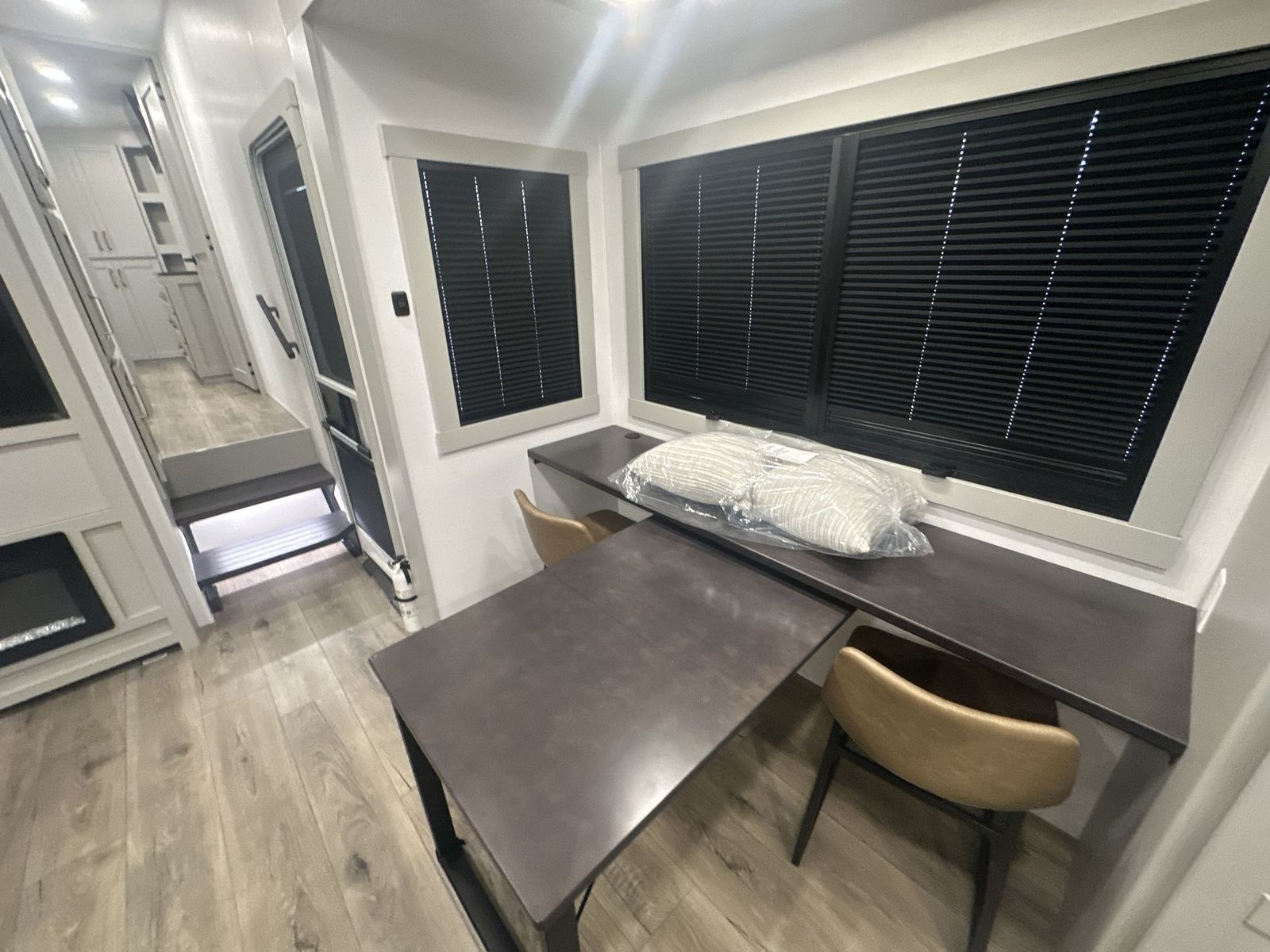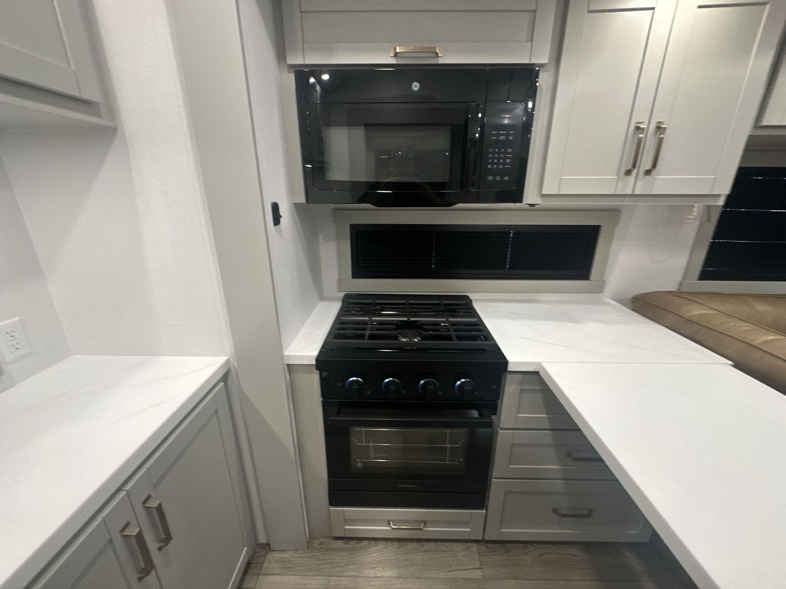 Brinkley Model Z 3200 fifth wheel highlights: L-Sofa with Five Recliners Flip-Up Countertop Fireplace Dual Awnings Shoe Storage Escape to a world of comfort and luxury with this incredible fifth wheel! The living area features a plush L-sofa, five recliners, and a warm fireplace. The versatile dining table/L desk seats up to four people, making it perfect for meals, work, or play. Ample shoe storage and a convenient spot for pet bowls enhance comfort and practicality. The kitchen offers stunning solid surface countertops, dishwasher prep, a residential microwave, and a three-burner cooktop. The expansive pantry with pull-out drawers provides ample storage for your favorite ingredients and cooking essentials. The full bathroom is a serene oasis, featuring a linen closet for added storage and convenience. The front bedroom is a peaceful sanctuary, featuring a spacious king bed, shelves, and a sliding dresser top with hidden storage. The generous wardrobe and shoe rack provide ample storage for your clothes and shoes. The Brinkley mid-profile Model Z fifth wheels bring you clean lines and an upscale look with plenty of style and exciting new features like the industry first brass plumbing connections. These units also feature an automotive grade front cap, plenty of exterior storage, exterior hot and cold showers, and wide stance leveling jacks for easy set up.Residential frameless windows provide a clean look and beautiful views, and ample electrical outlets and 6 USB/USB-C outlets allow all of your electronics and appliances to easily be used and charged.