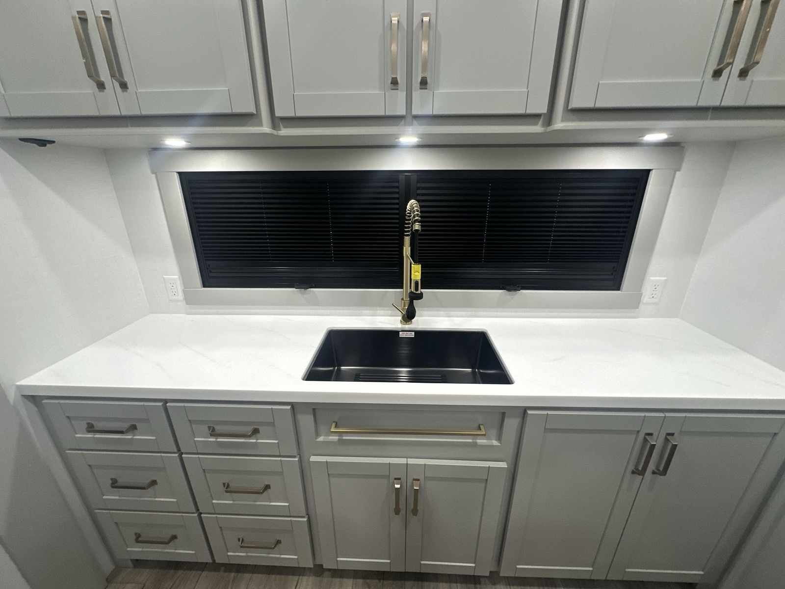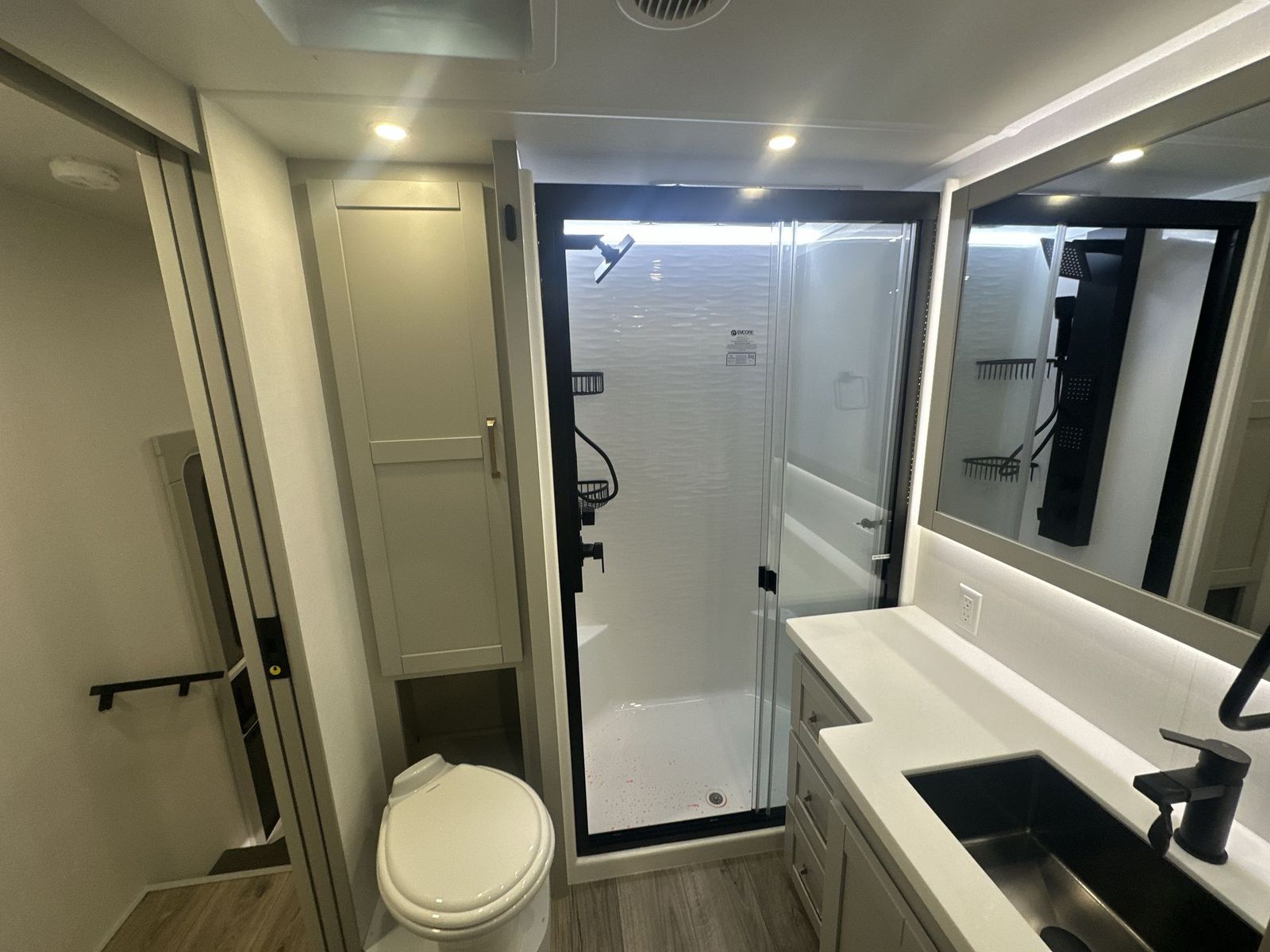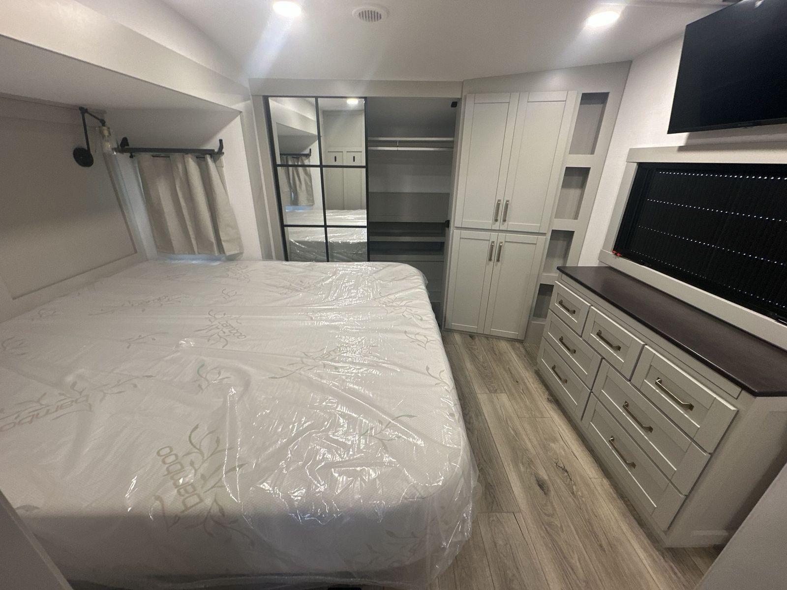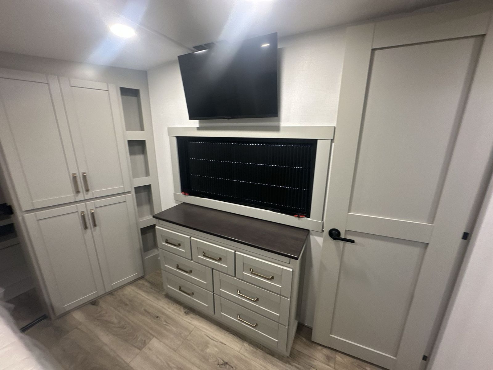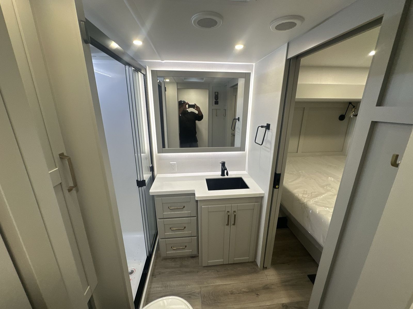 Brinkley Model Z 3200 fifth wheel highlights: L-Sofa with Five Recliners Flip-Up Countertop Fireplace Dual Awnings Shoe Storage Escape to a world of comfort and luxury with this incredible fifth wheel! The living area features a plush L-sofa, five recliners, and a warm fireplace. The versatile dining table/L desk seats up to four people, making it perfect for meals, work, or play. Ample shoe storage and a convenient spot for pet bowls enhance comfort and practicality. The kitchen offers stunning solid surface countertops, dishwasher prep, a residential microwave, and a three-burner cooktop. The expansive pantry with pull-out drawers provides ample storage for your favorite ingredients and cooking essentials. The full bathroom is a serene oasis, featuring a linen closet for added storage and convenience. The front bedroom is a peaceful sanctuary, featuring a spacious king bed, shelves, and a sliding dresser top with hidden storage. The generous wardrobe and shoe rack provide ample storage for your clothes and shoes. The Brinkley mid-profile Model Z fifth wheels bring you clean lines and an upscale look with plenty of style and exciting new features like the industry first brass plumbing connections. These units also feature an automotive grade front cap, plenty of exterior storage, exterior hot and cold showers, and wide stance leveling jacks for easy set up.Residential frameless windows provide a clean look and beautiful views, and ample electrical outlets and 6 USB/USB-C outlets allow all of your electronics and appliances to easily be used and charged.