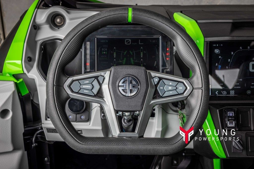 As the new Teryx® side x side flagship, it was important that the Teryx4/5 H2 side x sides look the part. The sleek, low-profile design, wide stance, and aggressive front-end are complemented by luxuriously painted Lime Green bodywork—a head-turning combination that conveys both its high level of performance as well as its high-grade build.