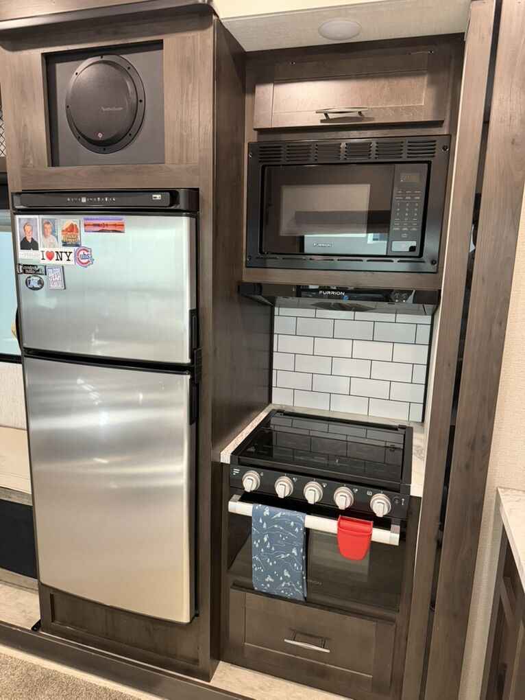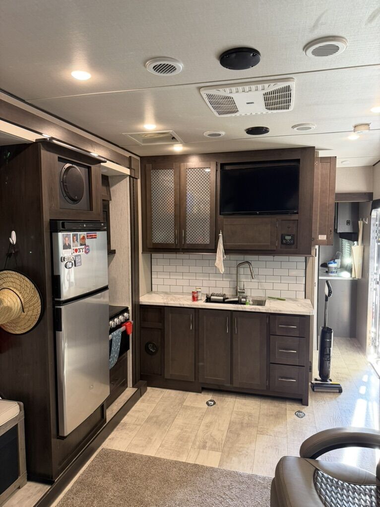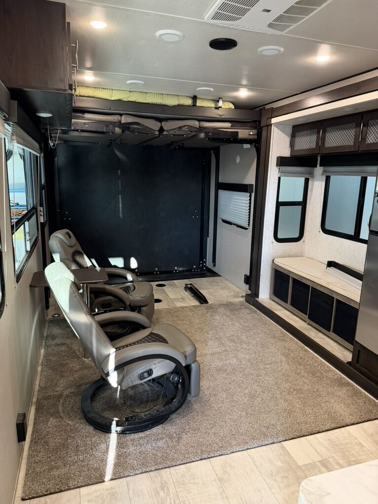 Factory Features Include • Rear garage with ramp door and tie-downs • HappiJac power bed and dual opposing sofas in garage • Power awning with LED lighting • Fuel station with 30-gallon fuel capacity • Heated and enclosed underbelly for extended season camping • Large pass-through storage • Stabilizer jacks • Residential kitchen with large refrigerator and microwave • Three-burner stove and oven • Spacious bathroom with large shower • Private front bedroom with queen bed and wardrobe storage • TVs and entertainment system • Solar and backup camera prep • 100-gallon fresh water capacity, ideal for dry camping