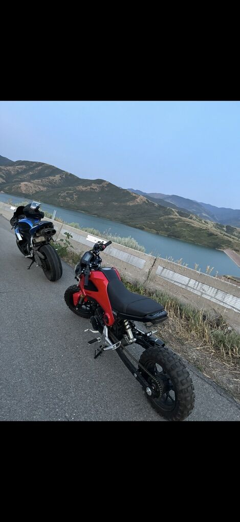 ZelleStretched Honda grom with some mods Usb and usbc charger to charge your phone Phone holder Stretched kit upgraded chain Nub wheels Led lights n turn signals Upgraded exhaust so it sounds nice Shift n clutch levers Etc Really fun bike to ride around town with friends or as a daily commute 100mpg Clean title in hand