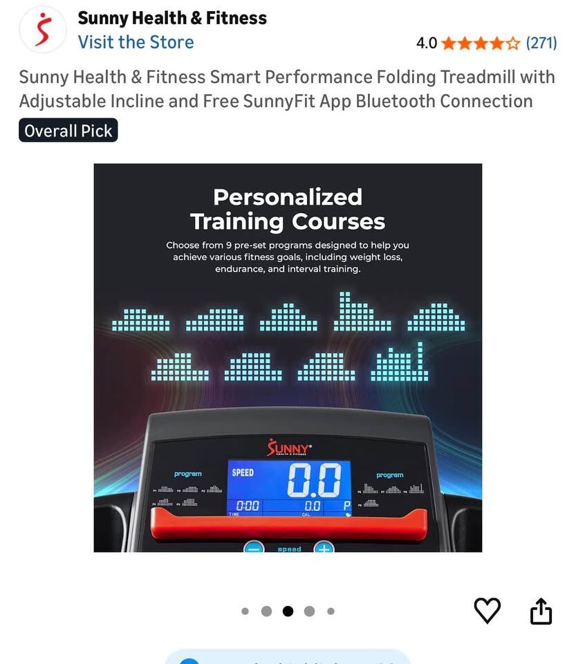 Powerful Drive System: This treadmill is equipped with a robust 2.2 horsepower motor and adjustable speed levels of up to 9 MPH for smooth and efficient performance whether you’re walking briskly or running intensely Adjustable Incline Levels: Offering 3 incline settings, this treadmill allows you to target different muscle groups and enhance calorie burn, providing a versatile and challenging workout experience that adapts to your fitness goals Connected Fitness: Sync this treadmill to your smart devices via Bluetooth to the free SunnyFit app, opening access to over 1000 plus workouts and 10,000 plus scenic global rowing routes. Personalize and track your progress in real-time as you run 9 Pre-Set Programs: Features 9 pre-set programs designed to target specific fitness goals such as weight loss, endurance, and interval training. These programs add variety to your workouts, keeping your training routine engaging and effective Digital Monitor and Quick Access Buttons: The advanced digital monitor displays key metrics like time, distance, speed, and calories burned. Quick access buttons enable easy adjustments during your workout for a smooth, user-friendly experience Pulse Sensors and Handrail Controls: This treadmill features integrated pulse sensors and handrail controls for added convenience. For precise real-time heart rate tracking, consider the HR200, which can store up to 8 hours of BPM data (sold separately) Joint-Friendly Running Surface: The 49" x 16" surface area provides plenty of space for comfortable strides, accommodating users of different heights. Its cushioned surface helps to reduce joint impact, enhancing workout safety and comfort Durable Construction: Built to support up to 285 LB, this treadmill features a sturdy frame and high-quality materials that ensure stability and long-lasting durability. It provides reliable performance for both home and recreational use Easy Storage and Safety: Features a soft drop folding mechanism for convenient, compact storage. Additionally, it includes an emergency stop clip to enhance safety and provide peace of mind while you exercise