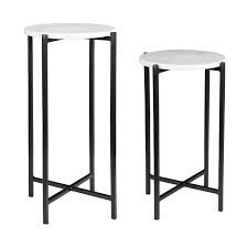 Designed with varying heights, this set of two accent tables will add interest to your favorite room. Each iron frame is finished in a matte black and topped with a thick piece of white marble with gray veining. Place together beside your favorite chair, or separately wherever needed.