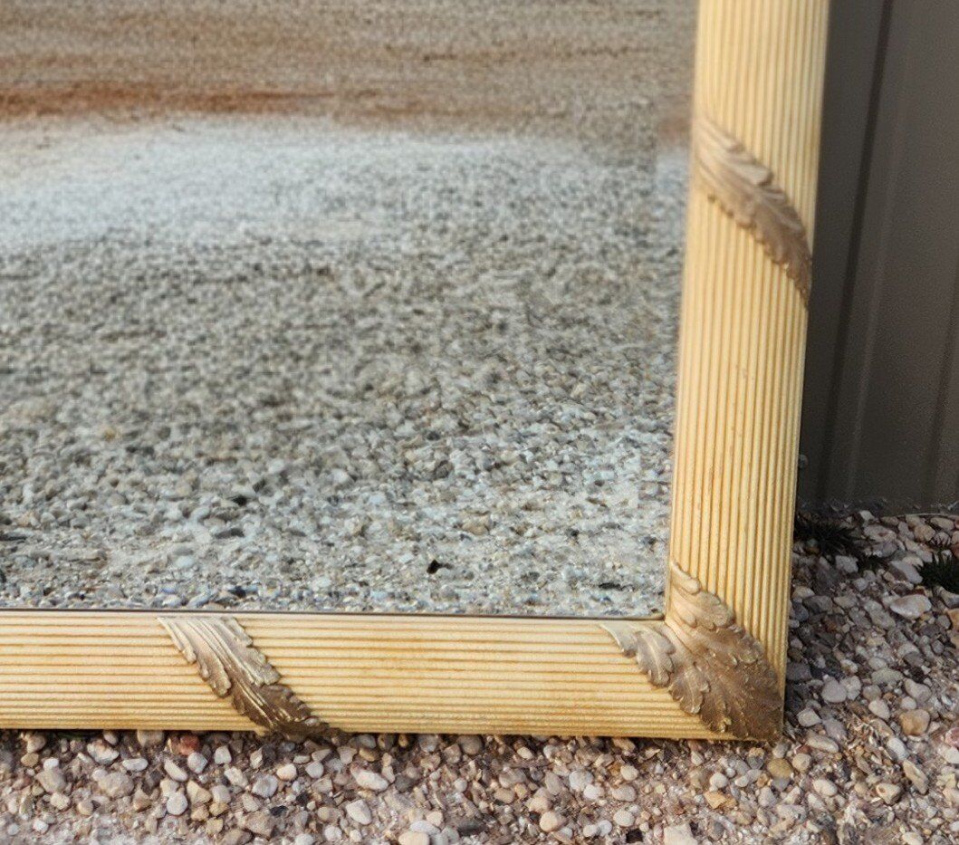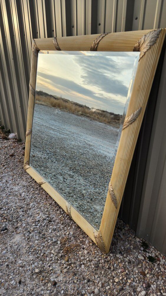 This mirror is 56 inches x 56 inches. The wooden frame is solid and decorative.