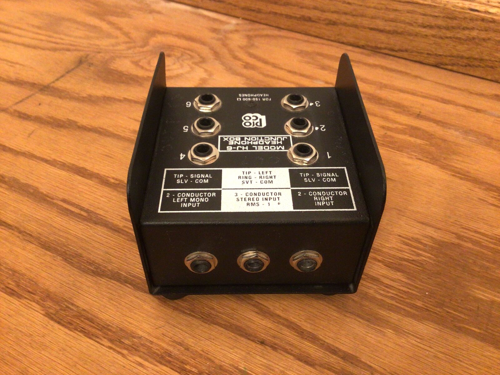 This Pro Co HJ6 6-Channel Headphone Junction Box is in good, used condition and is fully functional, showing only minor cosmetic signs of wear consistent with normal use. This rugged, passive device is perfect for distributing audio signals from a power amplifier to up to six pairs of headphones without requiring a separate power supply. Built with a heavy-duty 16-gauge steel enclosure and non-skid feet, it features dedicated 1/4" left/mono, right, and stereo inputs, along with six individual 1/4" stereo headphone outputs, making it a durable and reliable solution for studio, broadcast, or assistive listening applications.