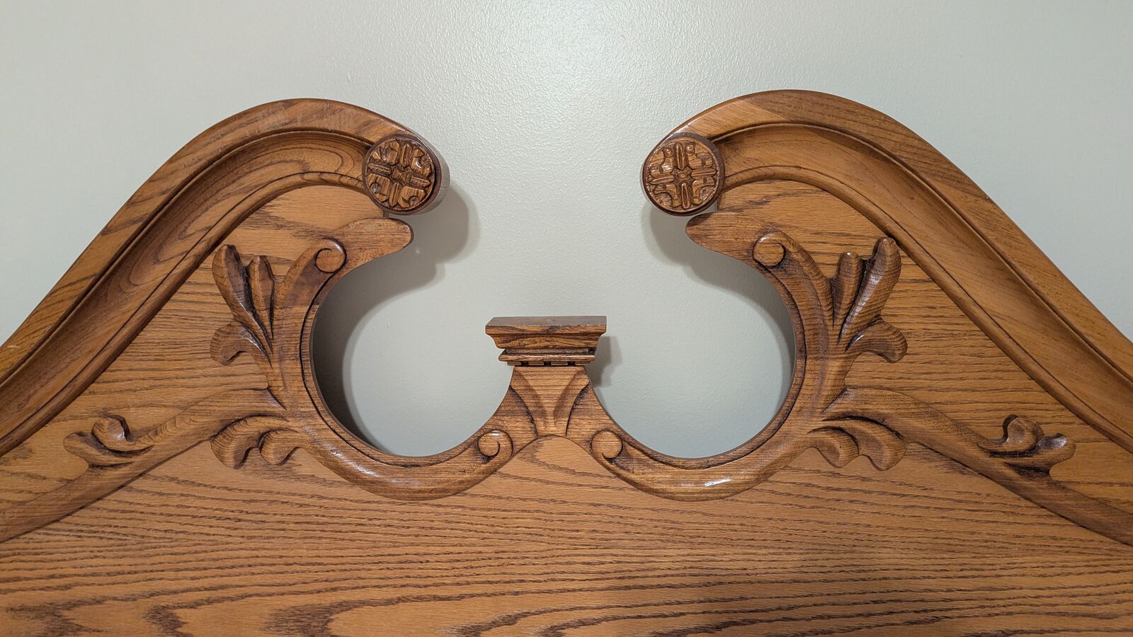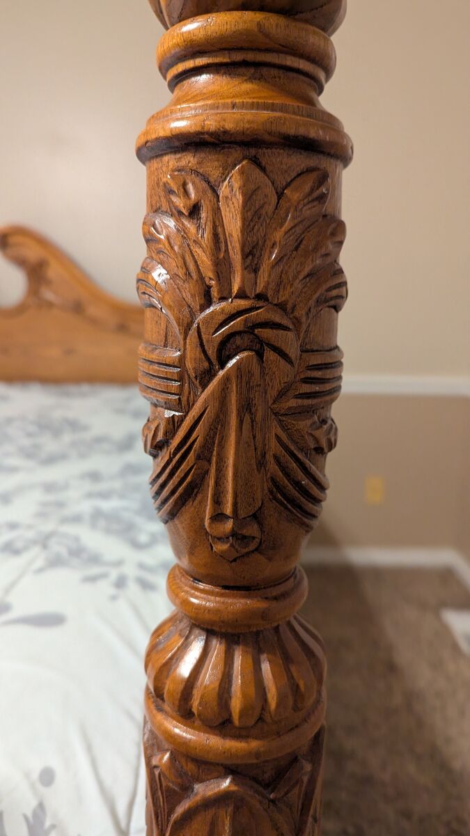 PayPalBeautiful, heavy-duty King Sized four-poster bedframe with a matching triple-mirror dresser. This set features intricate hand-carved detailing throughout the twisted posts and headboard. Extremely sturdy and built to last.