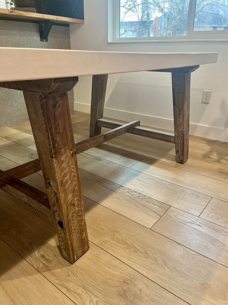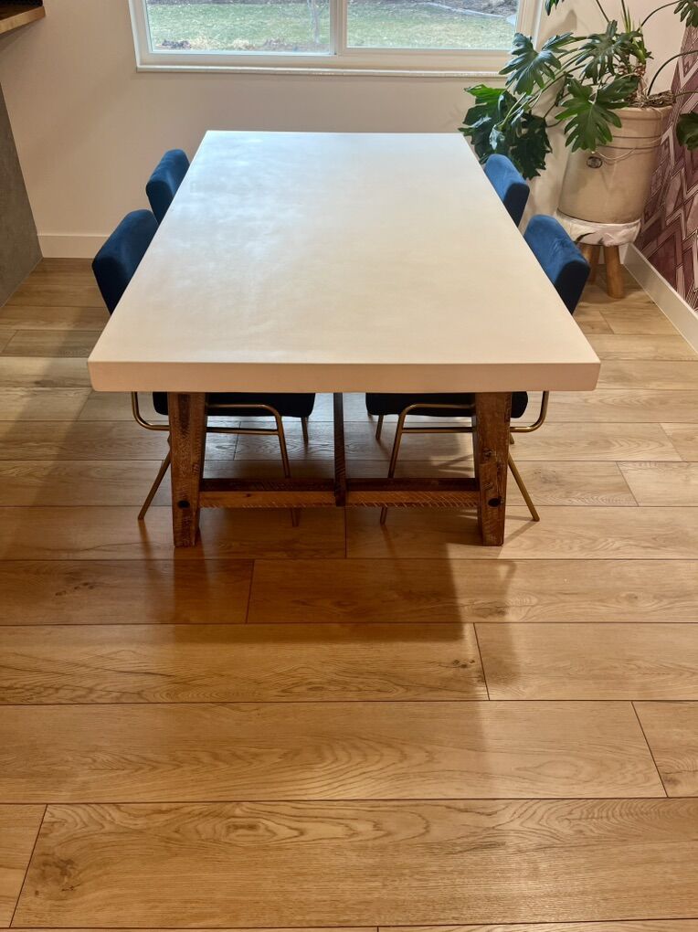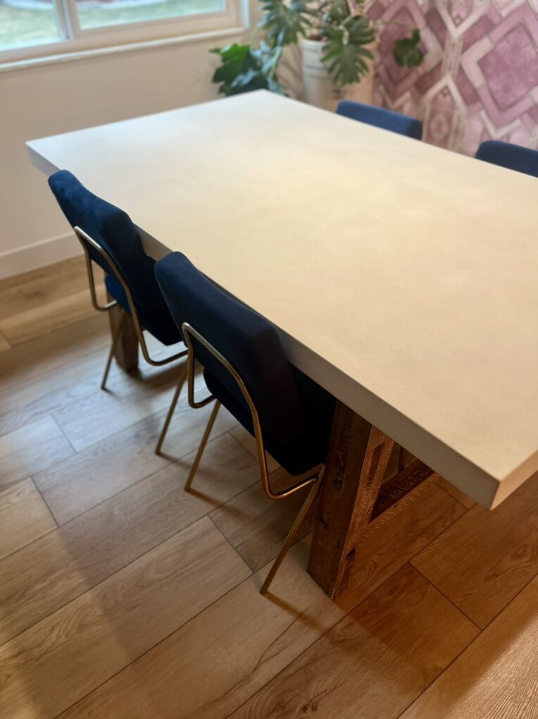 VenmoDowneast dining table with a white cement top with wooden base. Very heavy duty and in excellent shape. 4 West Elm velvet navy dining chairs. The legs are made from metal and the chairs are very sturdy. The chairs also are in great shape. $600 for the table $400 for the set of chairs