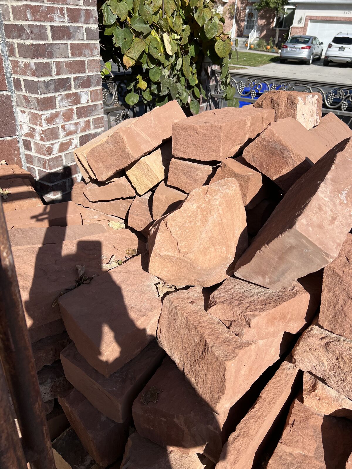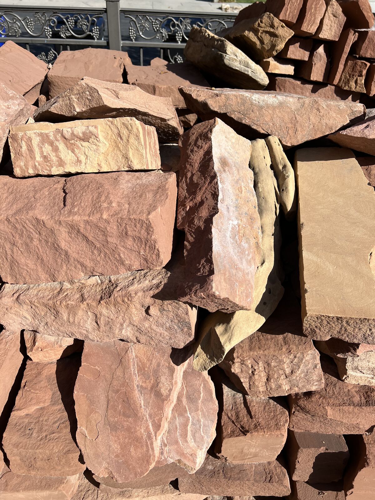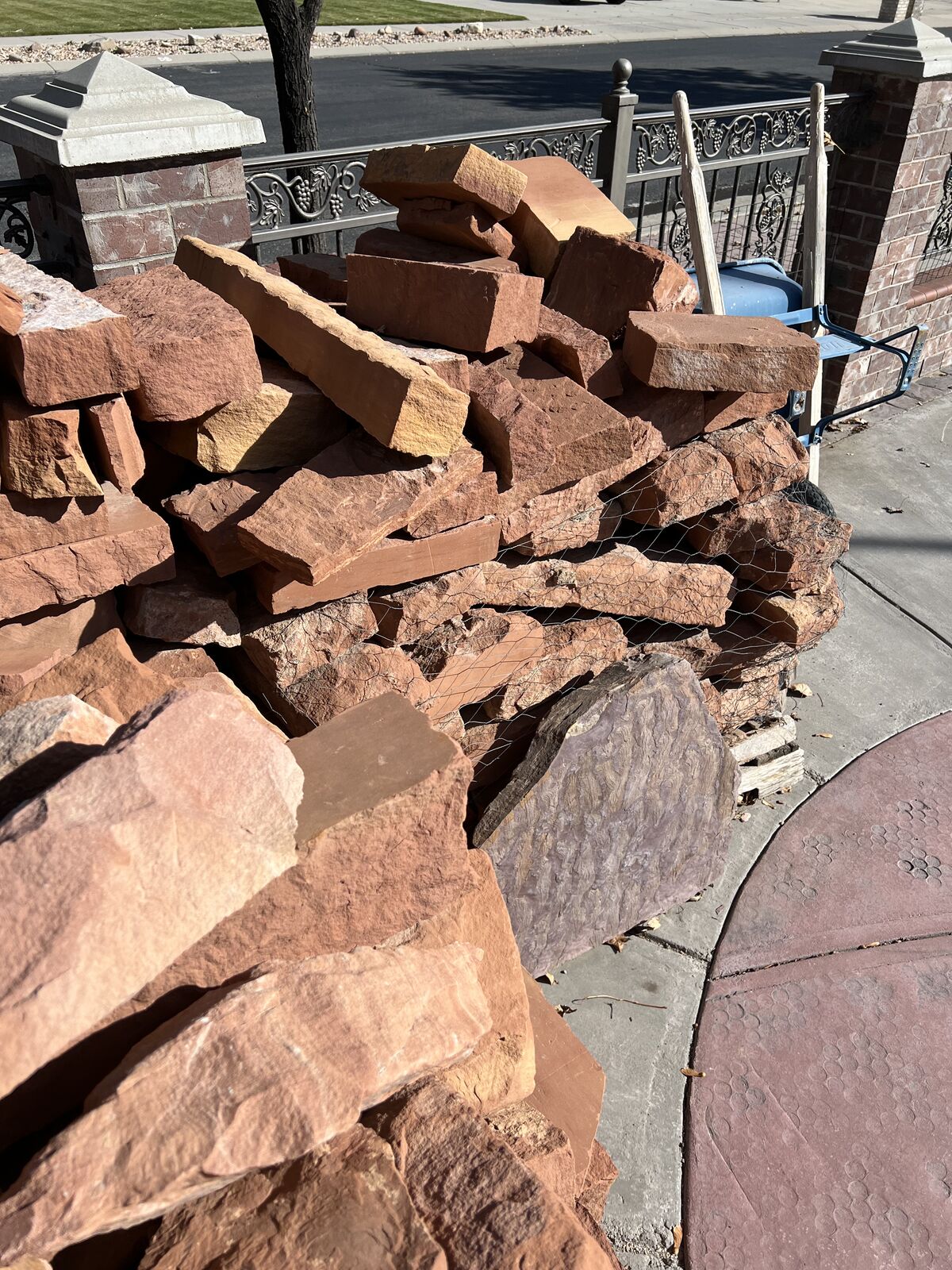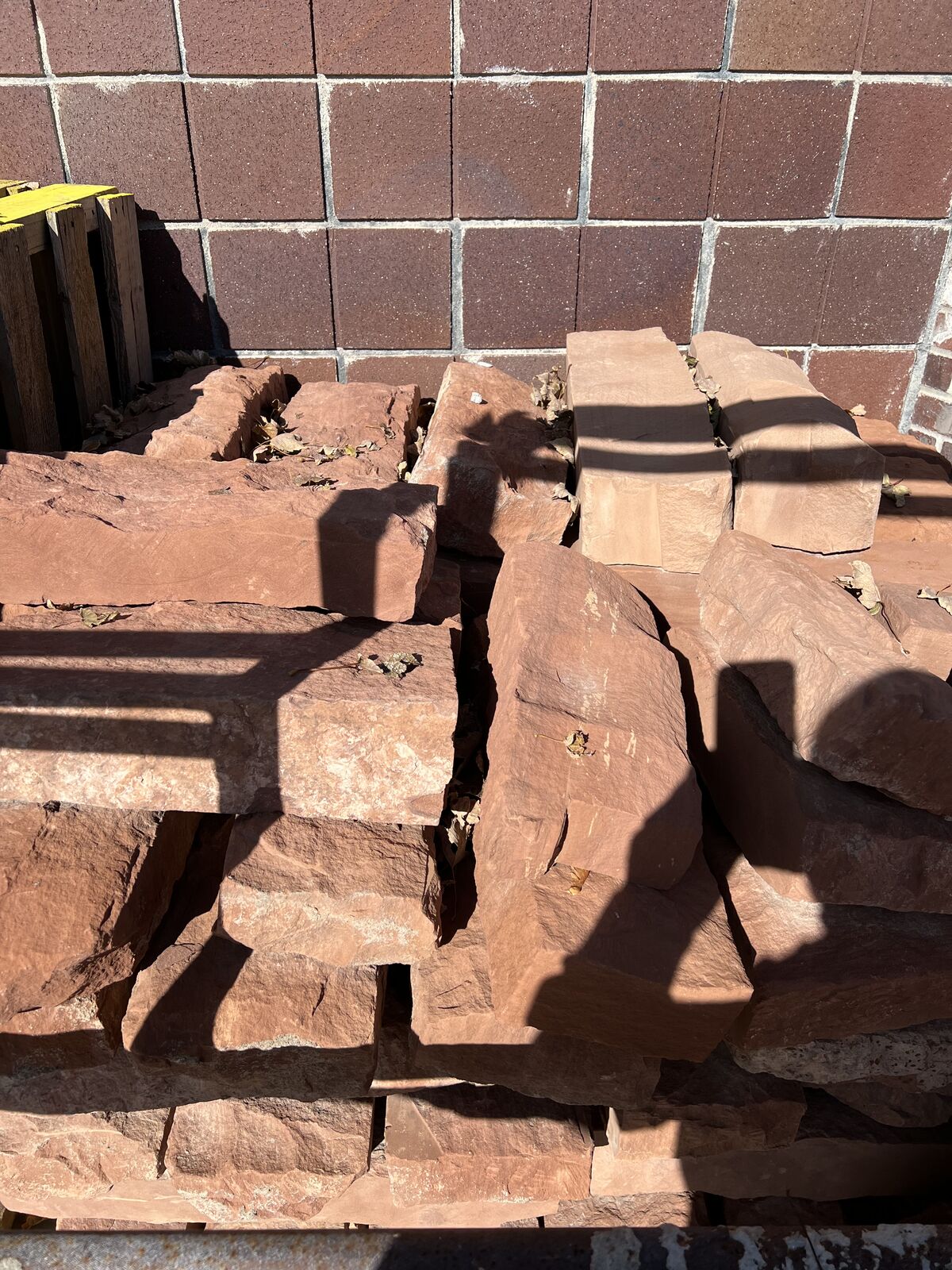 Red rock I have about 7 pallets of rock, bought for some masonry but changed direction. The rock is heavy about 3-3.5 tons per pallet. Great for landscaping, retaining wall, shed, fireplace, mailboxes, garden boxes, patio you name it normally priced at $800 per pallet Im selling all seven for $2200 for fast sell. Local pick up only you must haul away however it is stacked on concrete easy access.