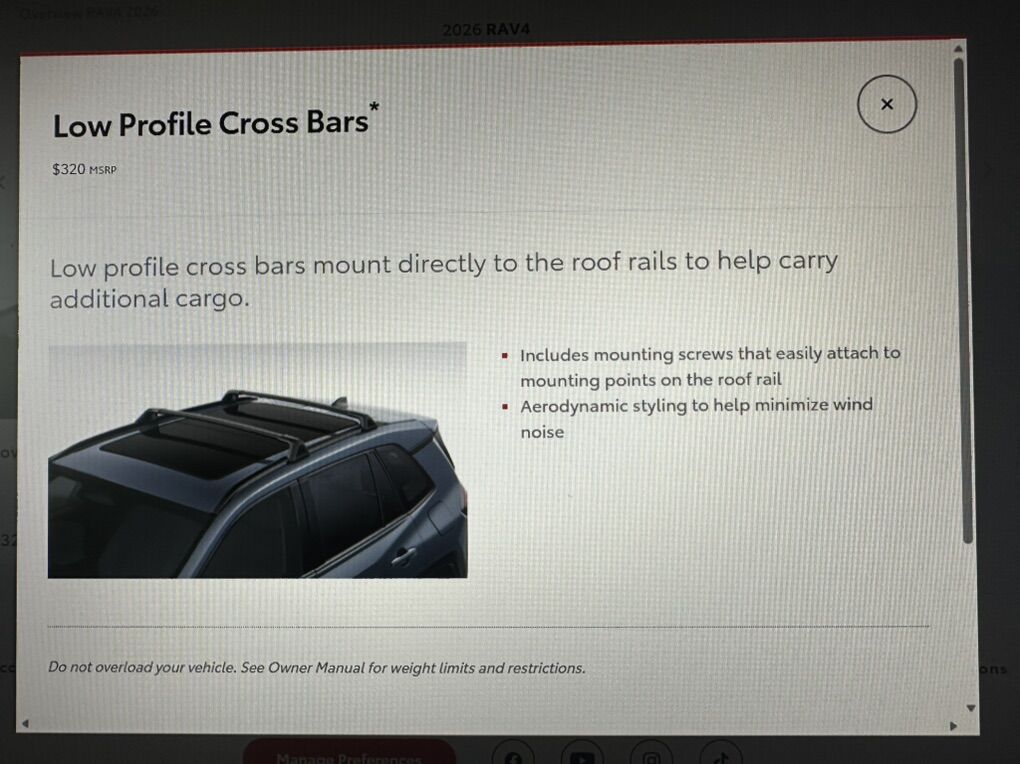 Here we have a pair of almost new Toyota OEM low profile crossbars that mount directly to the roof rails. Includes mounting screws and instructions. Only used one time. Designed for loading items on the roof like cargo boxes or ski and bike racks. Toyota website MSRP is $320.