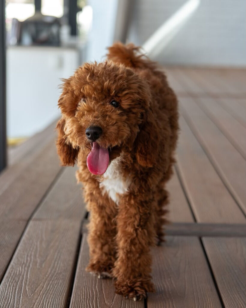 About MiloMilo makes the most beautiful mini Goldendoodle puppies—deep red with white markings.