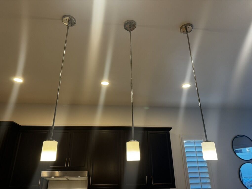 3 brushed nickel pendant lights with frosted glass! Beautiful in every kitchen and truly timeless. Lightbulbs included!