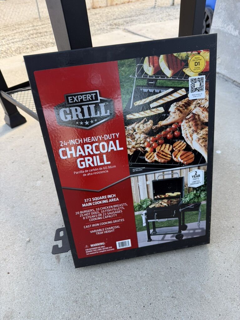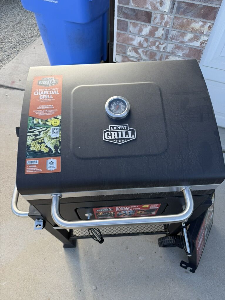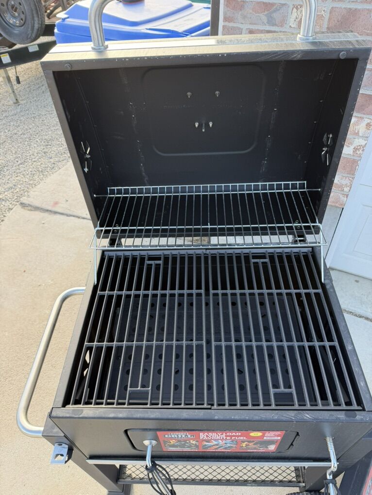 This was bought and partially assembled and never used. Never used. A little dusty but even the marketing papers haven’t been removed. It is missing 4 little bolts that held the side shelf up, probably $2 and an easy fix.