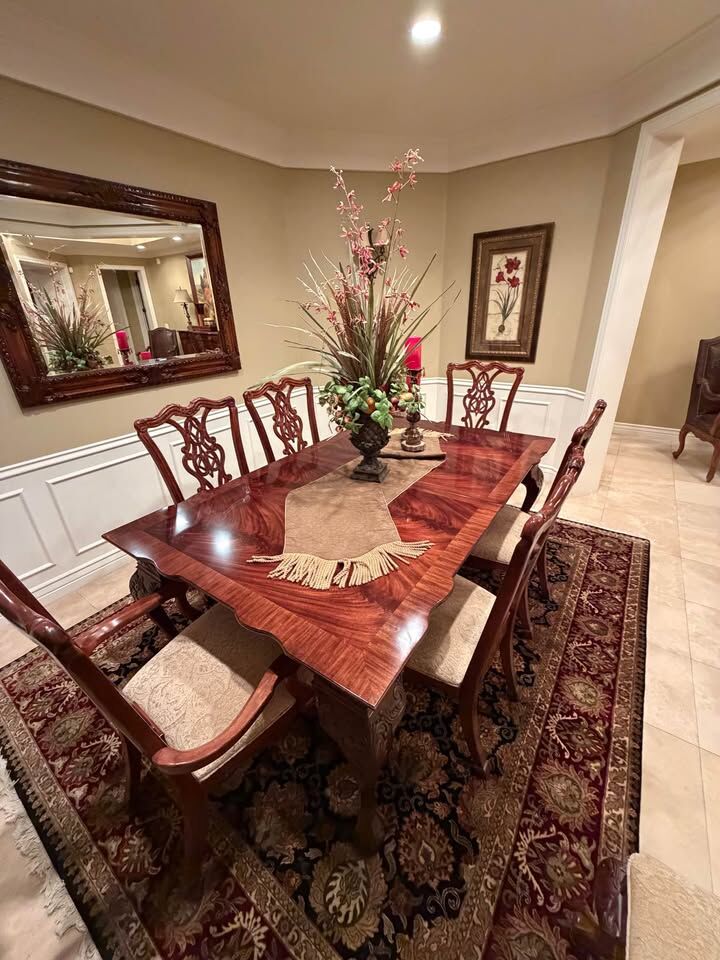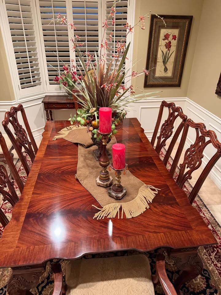 VenmoAbsolutely stunning solid wood dining table with 8 matching chairs. This is a high-end, formal dining set with beautiful wood grain, carved details, and extremely solid construction.