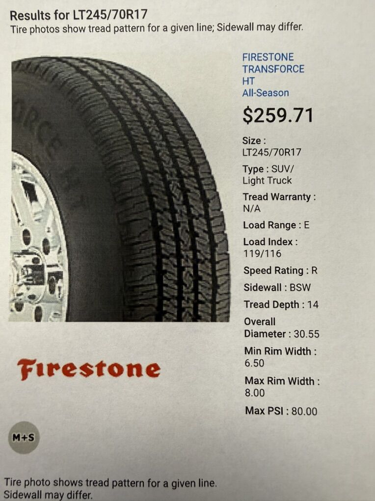 Venmo$575.00New- Retail is $1040.00.. Don’t Miss Out! I have 4 Brand New 245/70/17 Firestone Transforce HT All-Season Tires, Load Range E! … See More