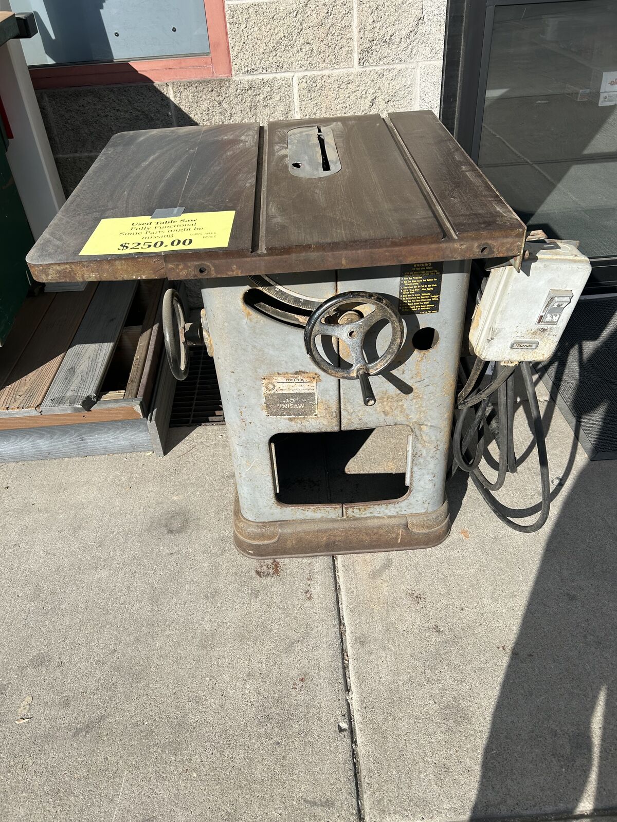 An old table saw we used to use in our Lumberyard it is still functional and has a fence both blade adjustments still work any parts that are missing I'm unaware of. price is negotiable first come first serve