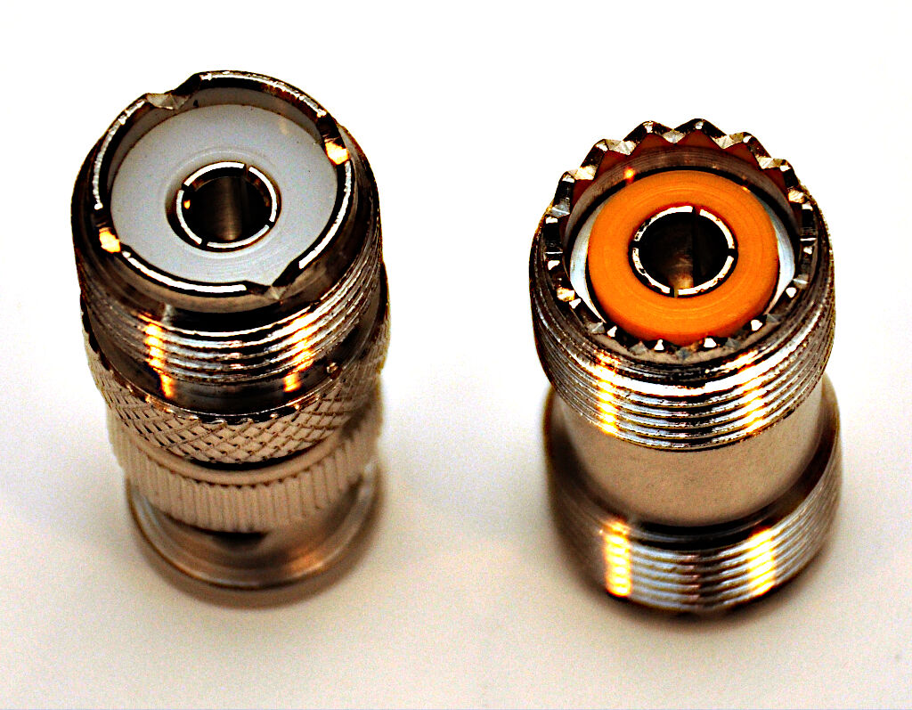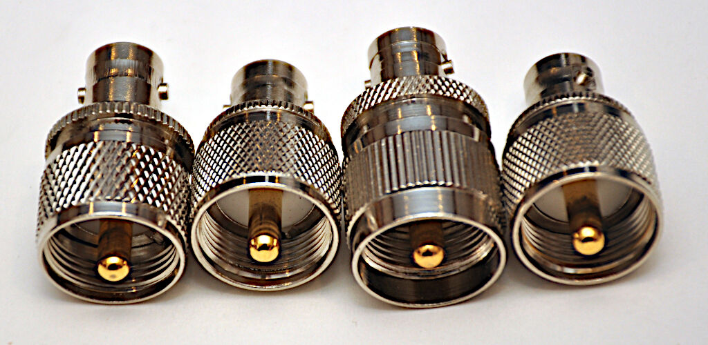 Shown are four PL-239 to BNC female adapters, one SO-239 to BNC male adapter, and one SO-239 to SO-239 adapter (both ends appear in the photos).