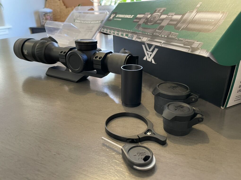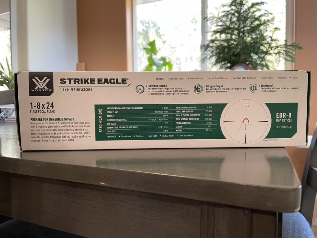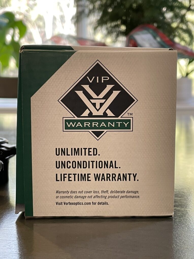 With a forgiving 3.9” eye relief and continuously adjustable magnification from 1x to 8x, this scope is very versatile. Because it has a reticle on the first focal plane, the holdover markings are accurate at any magnification — not just max. The illuminated reticle has 11 brightness settings (including 2 for night vision) and is easy to see in daylight. 1/4 MOA adjustments protected by capped turrets gives you excellent control over your zero. Water-proof, fog-proof, shock-proof, and protected by the Vortex VIP Unlimited Unconditional Lifetime Warranty.