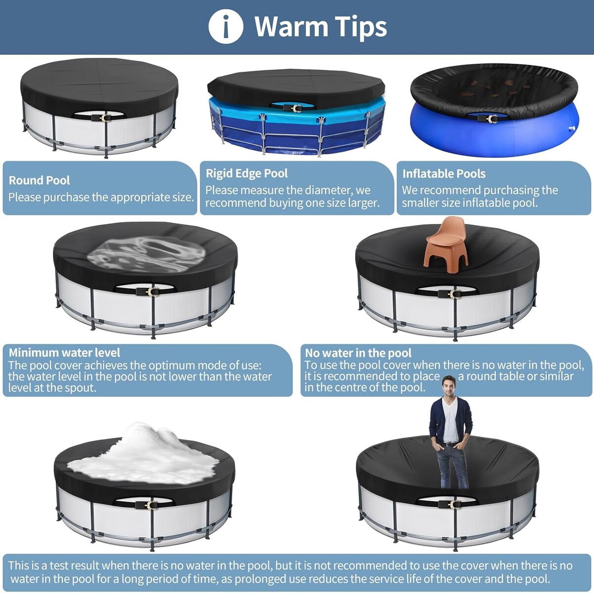 12ft-18ft Round Winter Pool Cover is a heavy-duty, black, waterproof, and dustproof cover designed for above-ground, frame, and inflatable pools. It features a reinforced ratchet strap and cable tightening system for easy, secure installation.