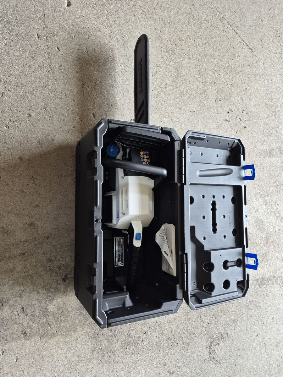 If you’re ready to ditch the hassle of a corded or gas chainsaw, look no further than the HART 40V Supercharge Brushless 16” Chainsaw Kit. It’s ideal for medium-duty jobs such as firewood cutting and yard cleanup. This chainsaw is lightweight, maneuverable, and powerful—perfect for felling medium-sized trees, getting rid of brush, and clearing up storm damage. The 2-step trigger makes it not only easy, but safe to turn on and off while working on trees. It also features an automatic oiler that releases oil onto the bar and across the chain to extend its life automatically. The side access cover makes adjusting the saw’s chain a snap, and the rear comfort grip provides enhanced control during extended periods of use. The brushless motor means you'll get more power, better runtime, and longer tool life. This kit comes with (1) 40V 4.0Ah lithium-ion battery, (1) 40V fast charger, (1) chain adjustment wrench with onboard storage, and (1) hard carrying case). The HART 40V battery included in this kit is compatible with all other HART 40V tools!