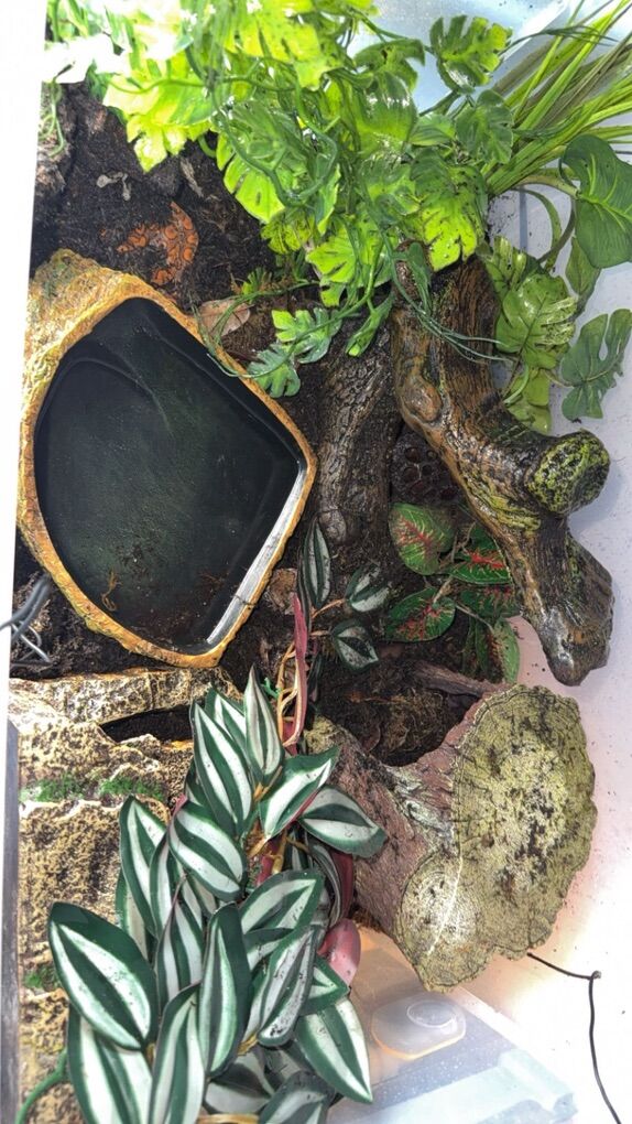 Comes with tub enclosure (as it is recommended they stay in tubs for the first year of life), 2 thermometers, a heating pad attached with a thermostat, dwarf white isopods, springtails, two hides a big water dish lots of fake plants. The soil is a mixture of reptisoil, coco fiber, leaf litter and moss.