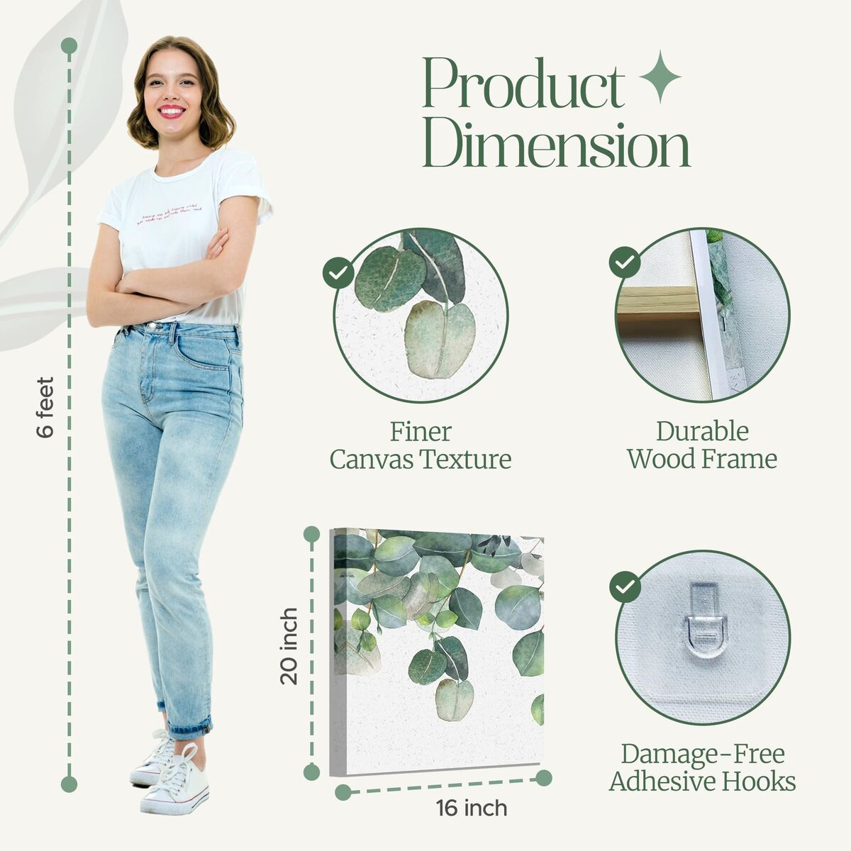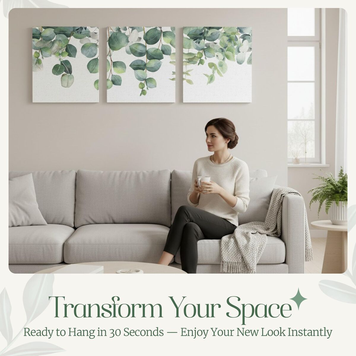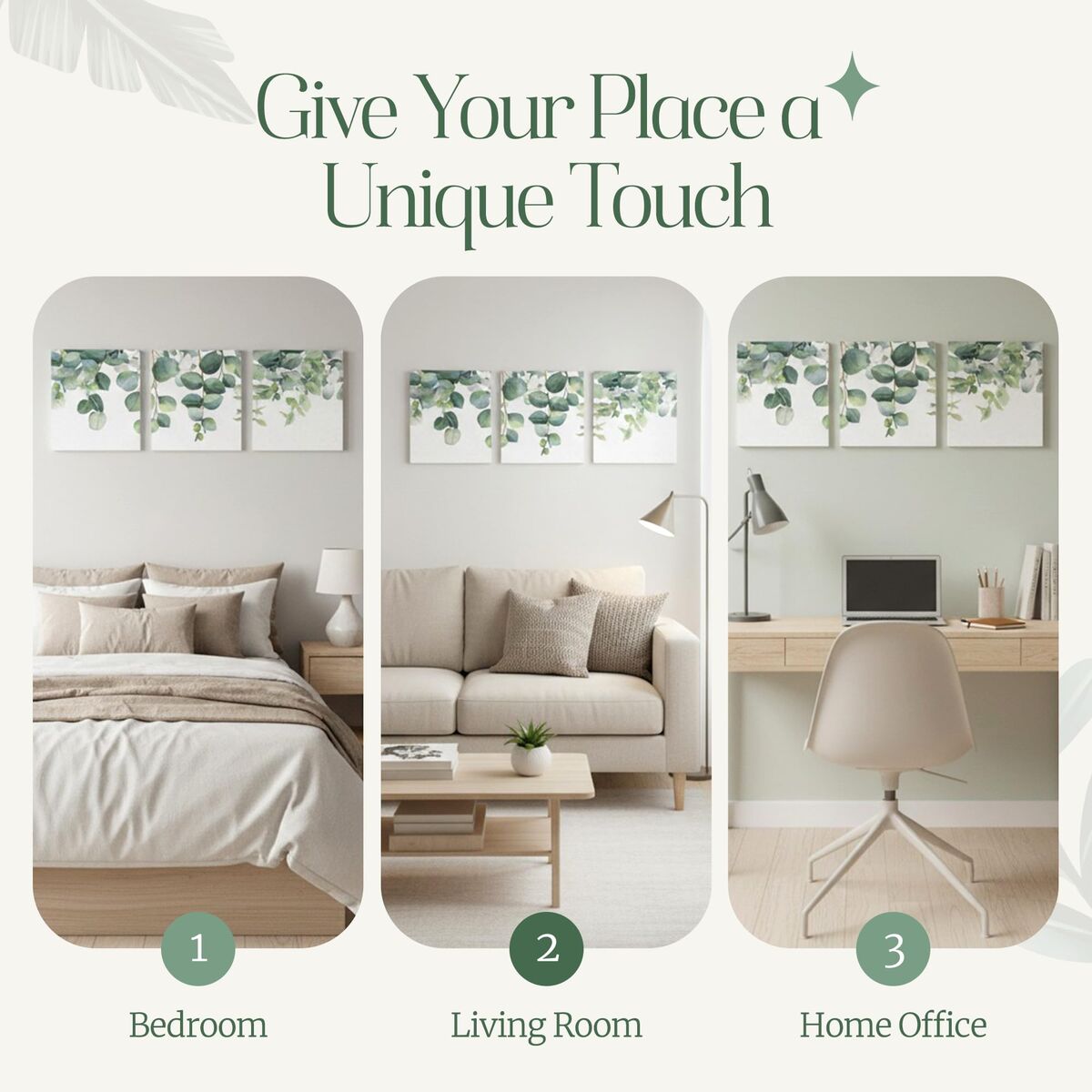 Transformative Minimalist Serenity: Instantly elevate your space with the Aria Walls Eucalyptus Wall Art Set, featuring cascading watercolor leaves in soft sage tones. Designed for modern minds seeking calm, each panel captures nature's quiet beauty in a minimalist style. Perfectly suited for design-conscious individuals, the soothing color palette and botanical theme make it a statement piece in Japandi, Scandinavian, or boho-inspired homes. Gallery-Grade Craftsmanship with Eco Framing: Printed on premium fade-resistant canvas and stretched over solid wood frames, each 16x20 inch piece is made to last. The high-resolution eucalyptus illustration adds depth and texture while the eco-conscious materials reflect intentional living. Built with the quality expected in upscale interiors, it brings gallery-level elegance into your personal space. Stress-Free, Tool-Free Installation: Enjoy art without the hassle. Each set includes invisible adhesive hooks for easy, damage-free mounting — ideal for renters or busy professionals. Hang all three panels in minutes without nails or tools, transforming your room into a calm sanctuary instantly. Versatile Fit for Any Room: Whether adorning a bedroom wall, adding sophistication to a home office, or enhancing a meditation corner, this wall art fits beautifully. Its neutral tones blend seamlessly with light wood, earthy textures, and soft furnishings. Group the panels together for a cohesive centerpiece or space them apart to visually balance different areas. Gift-Ready Presentation for Mindful Living: Arrives in aesthetically designed, ready-to-gift packaging, making it an ideal present for housewarmings, weddings, birthdays, or holidays. It’s more than just decor—it's a thoughtful expression of wellness, intentionality, and connection, perfect for those who cherish home as a sanctuary.