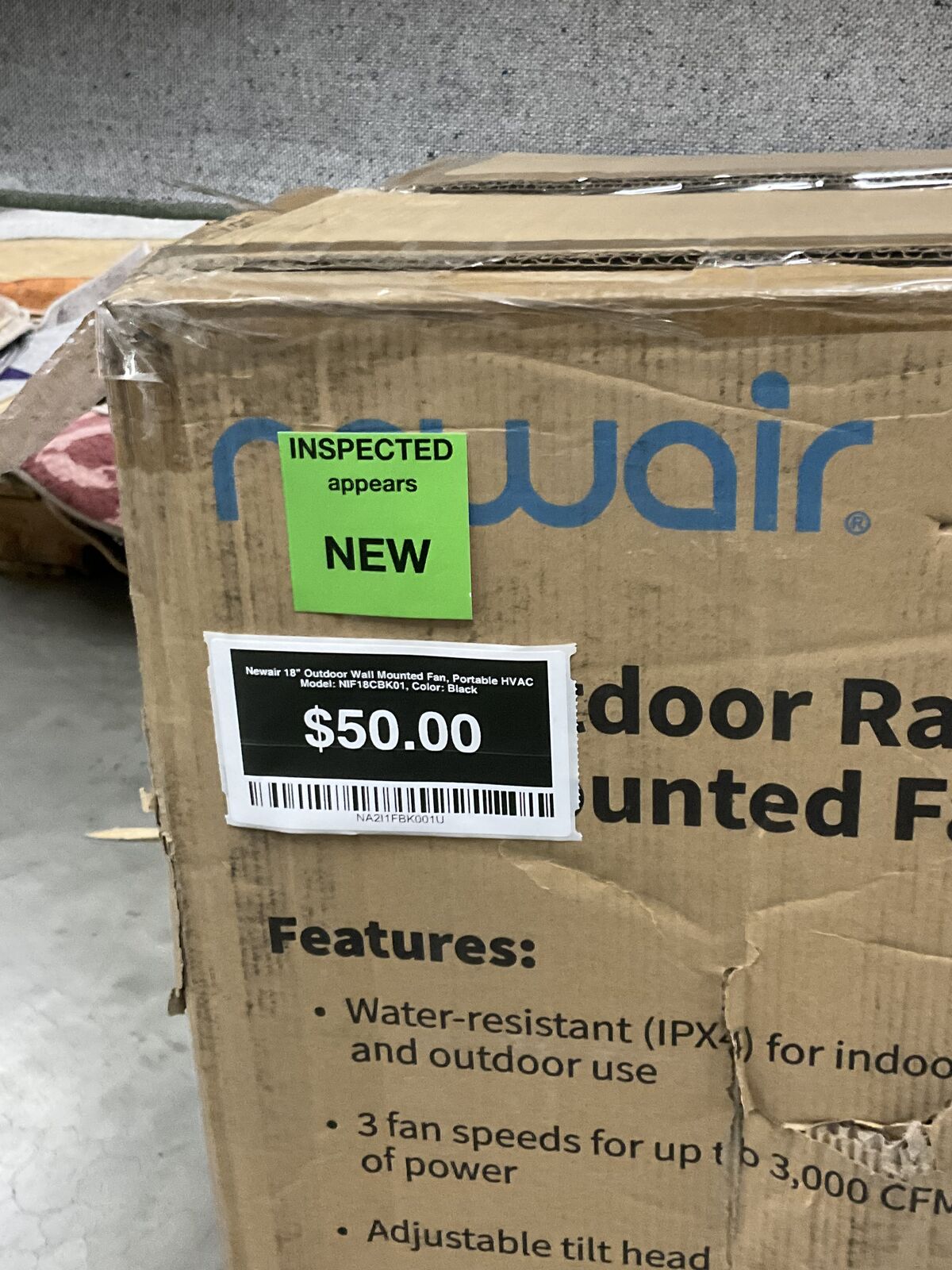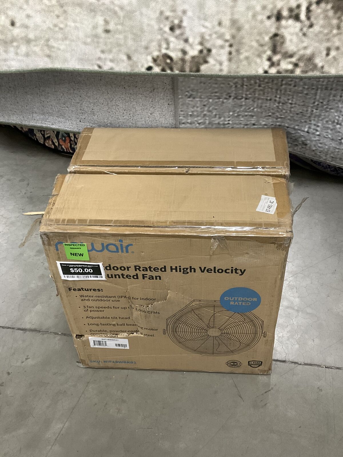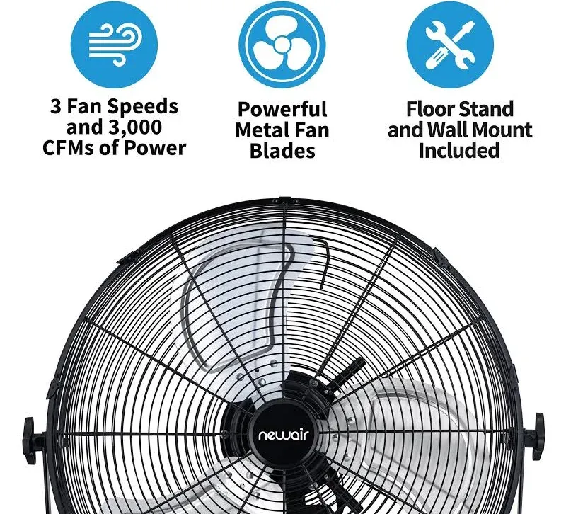 Newair 18" high-velocity outdoor wall fan designed for patios, garages, and workshops. Features a water-resistant motor and durable steel construction for outdoor use. Delivers powerful airflow up to 4,012 CFM with three speed settings, a 180° adjustable tilt, and pull-chain control. Includes a GFCI plug, wall-mounting hardware, and a 10-foot power cord for flexible installation.