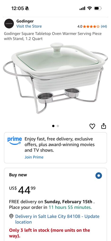 I have a white Godinger casserole dish with a clear lid. It comes with a silver stand that has holders for 2 warmers (not included). The dish without the stand and lid is 9 inches by 8 inches and 3 inches tall. The last picture shows that it sells for $44.99 plus tax on Amazon. See my other ads for jewelry, artwork, home decor and more.