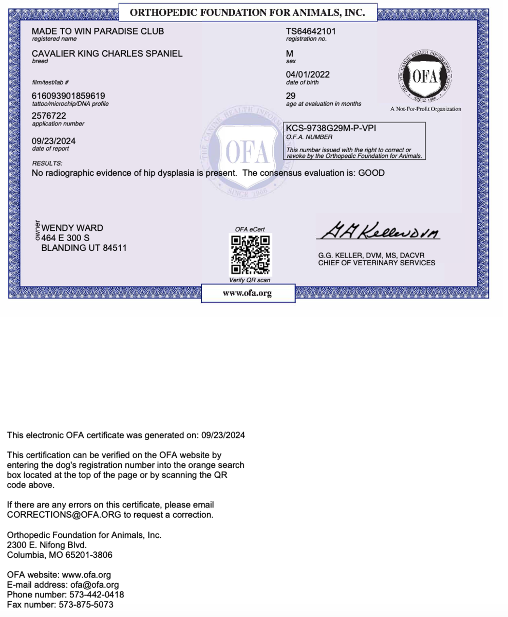 Pumbaa is an outstanding addition to our program and is a proven stud with a shining record of Eastern European Conformation titles and wins. At the end of point tabulation in September 2025, Pumbaa [BCH CH Made to Win Paradise Club] was the 47th AKC Cavalier in the Nation. This is HUGE. I am so proud that he is the sire of so many of my beautiful puppies.