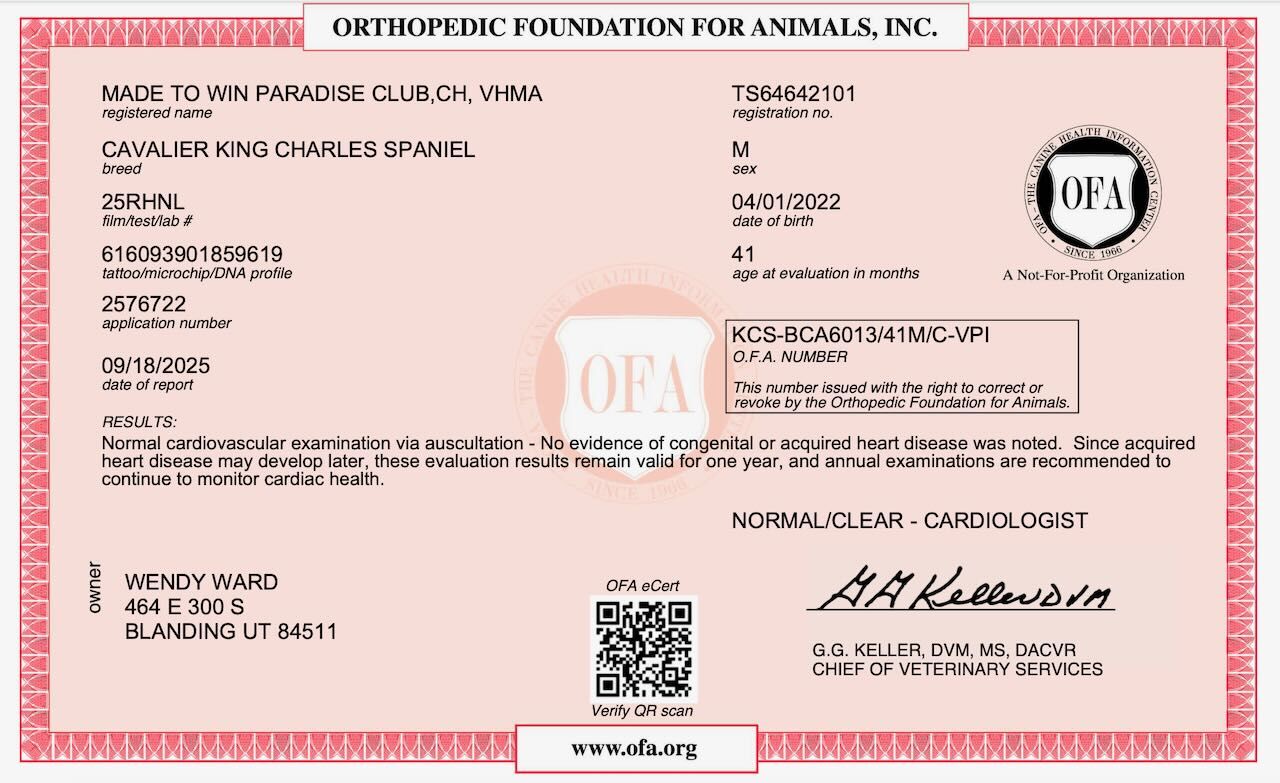 For Full AKC Regsitration of the litter, the fee is $2000 and I require a recent vet visit that shows no murmur and good patellas.
