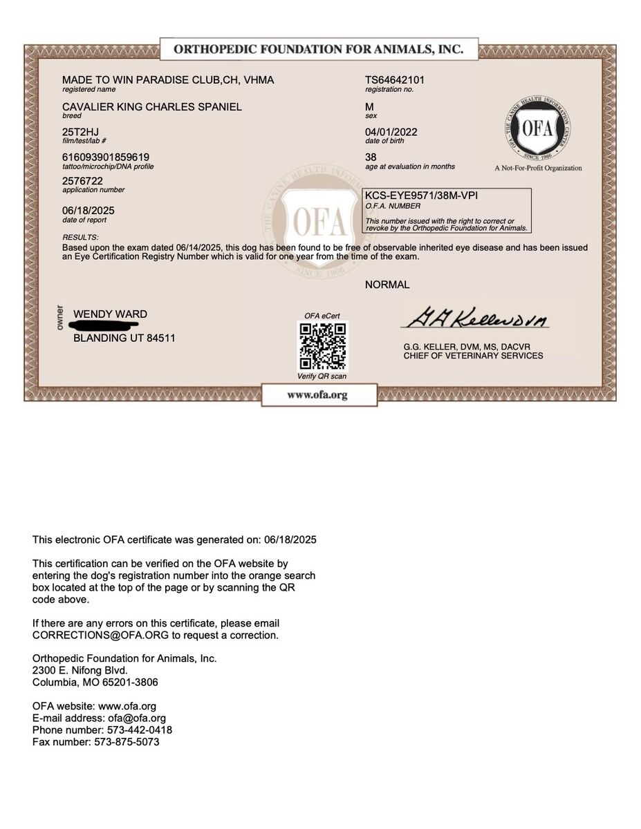 He is a lovable goofball that loves squeaky toys. He has perfect OFA testing and has received his CHIC #, indicating his successful testing. He has been recognized for his beautiful build, gait and expression by AKC judges as he worked toward his titles. He’s won Best of Breed multiple times and he’s placed well in the Toy Group competition more than once.