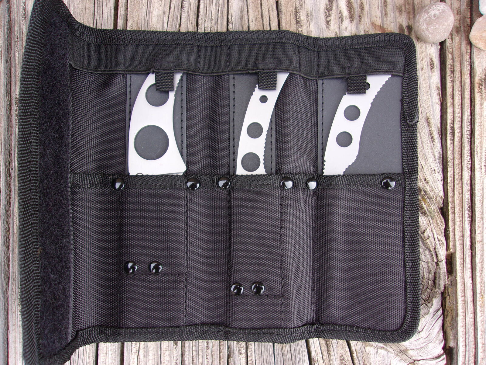 The Hunter's Tool Kit includes three fixed blade knives: a skinning knife, a caping knife and a gutting knife. The gutting knife zips through any large game animal with ease without busting open the guts or destroying valuable meat. The caping knife with its signature curve ensures that the skin and hide stays intact for the taxidermist. The skinning knife makes quick work of the process, regardless of if the animal has been hanging for a day or a week and a nylon sheath. The knives are constructed from stainless steel, are easy to clean, and are minimal in size and weight. Included is a sheath that provides a roll to hold all three knives.