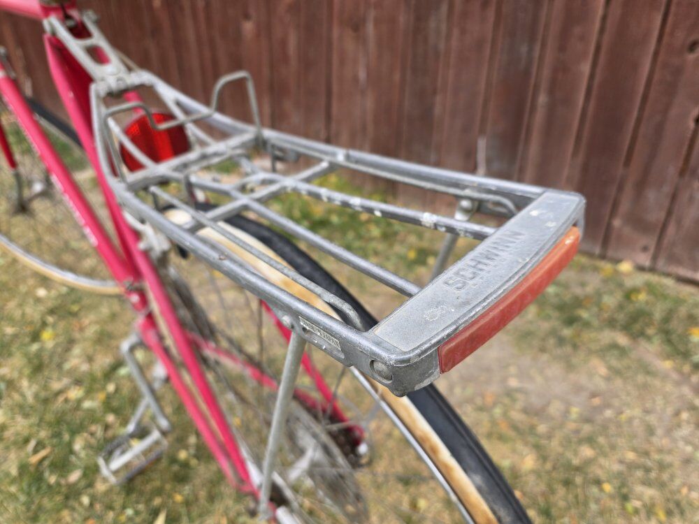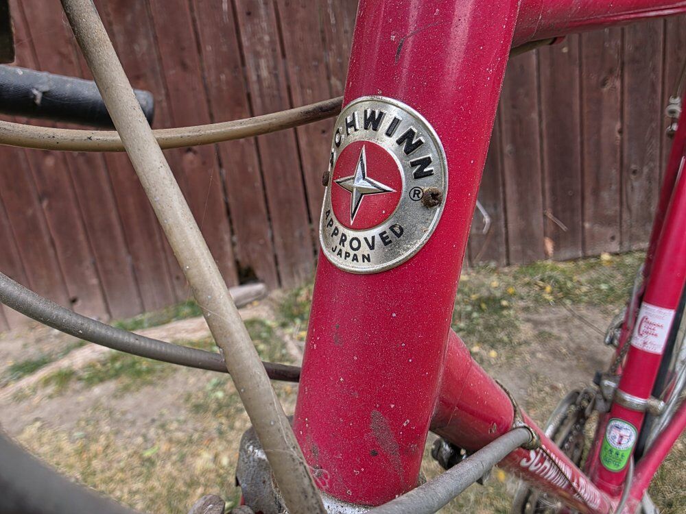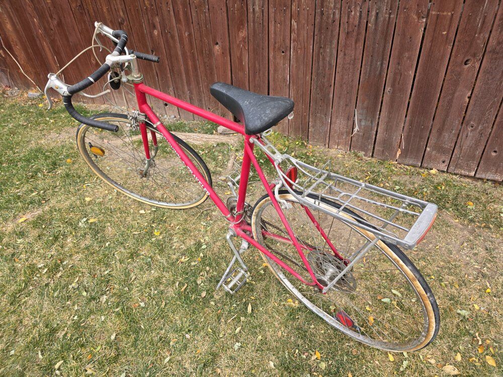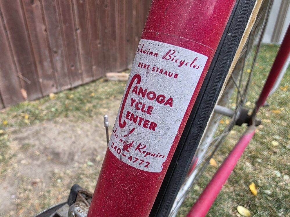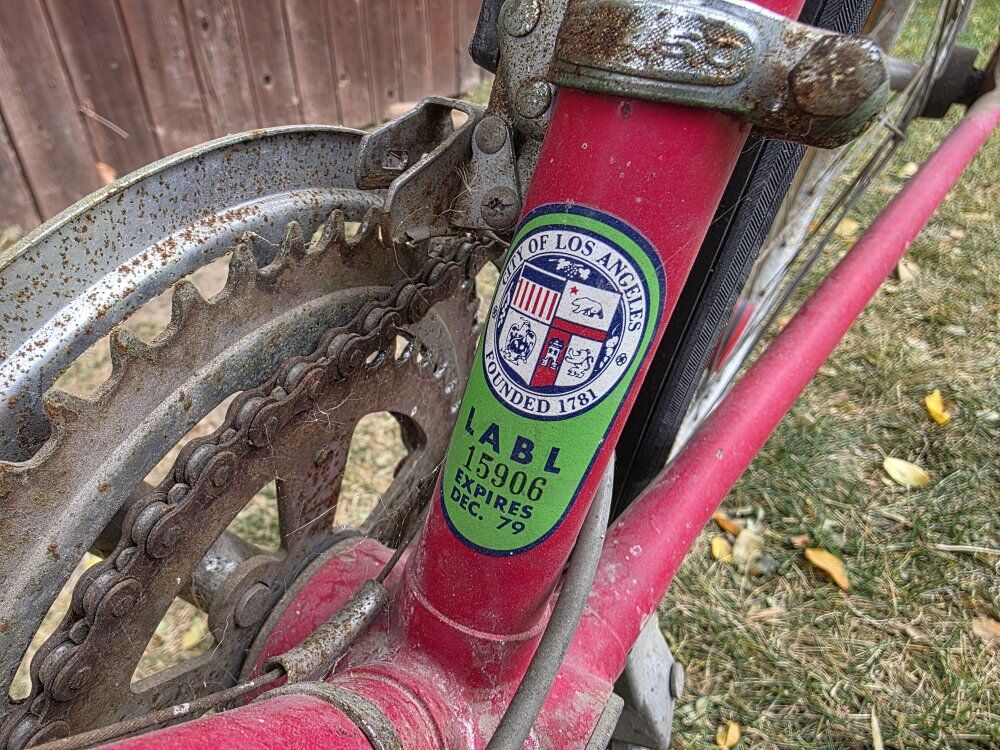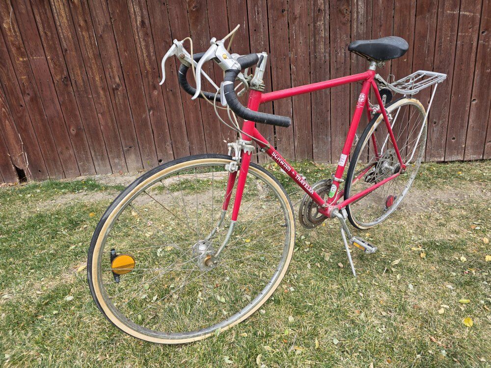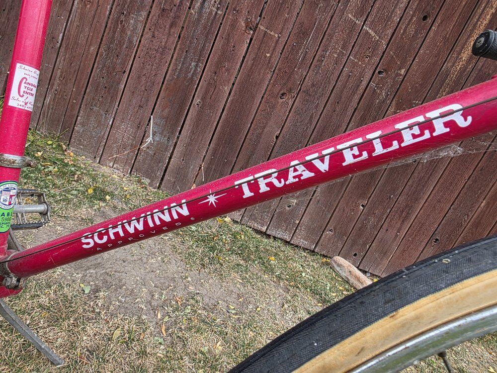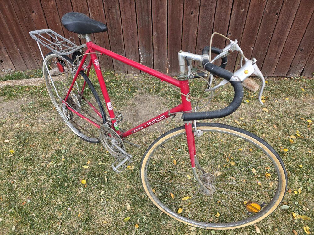 1975 Schwinn Traveler W23 10-Speed Bike. All Original, stored for decades. This is the first year of the Japanese made return of the Traveler Lightweight 10-speed since retired in 1966. Opaque Red paint, 23" frame. Needs cleaned up, serviced and new tires. Cool Old Bike! Check out the City of Los Angeles bike license! ~ $40