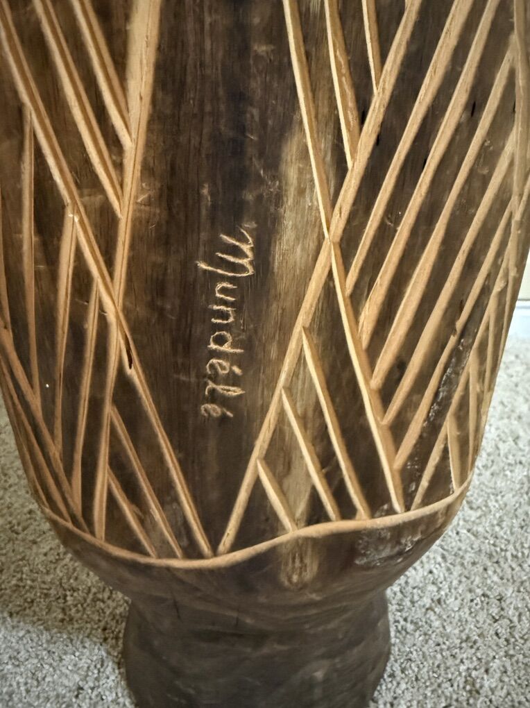 VenmoSigned by the artist- Mundele. One of a kind, hand carved. West African.Djembe with natural skin head. This is a full size, freestanding drum measuring 30 1/2 inches high and around 10 inches wide.