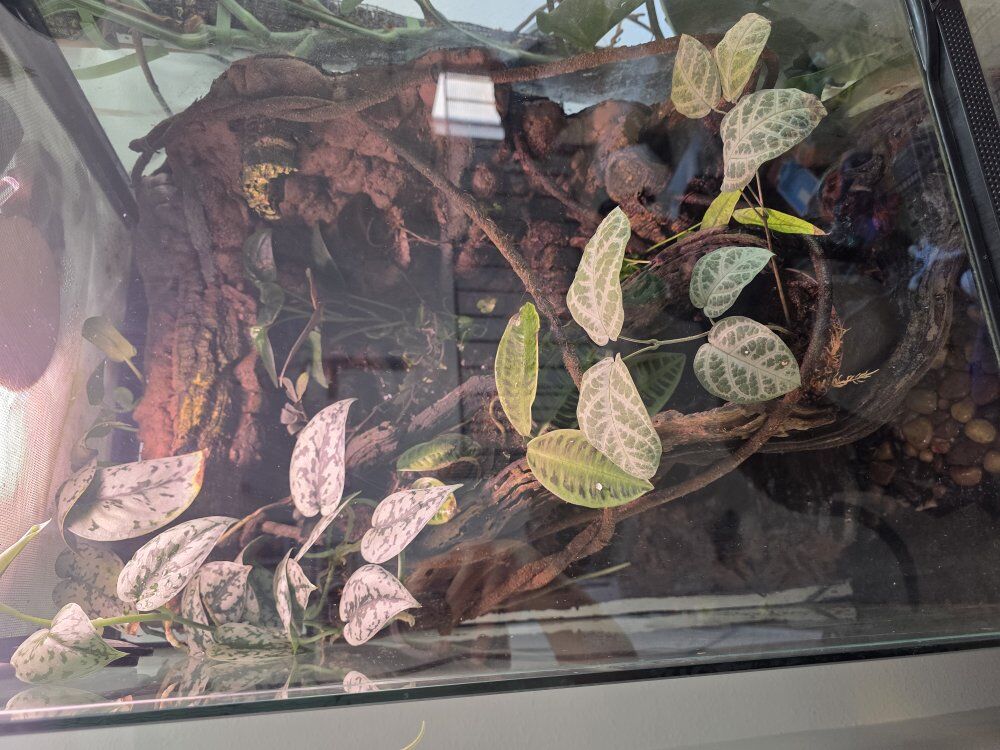 2 snowflake whites tree frogs, 1 Australian white tree frog. 3 frogs total, along with danios in water.