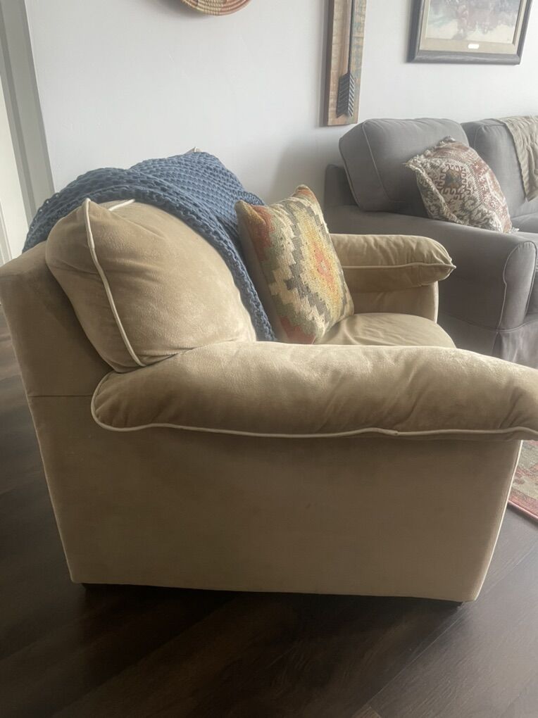 ApplePaySelling a couple of things take a look at my items. This is an oversized accent chair from DownEast furniture. It’s the suede like velvet type material easy to clean. I’ve actually professionally cleaned it in the last three months and it has no stains no rips, no tears, clean condition smoke and pet free home and children free you will need to pick up in Ogden. No delivery sorry. Asking 150 or best offer Cash or Apple Cash accepted or a credit card with a $20 fee