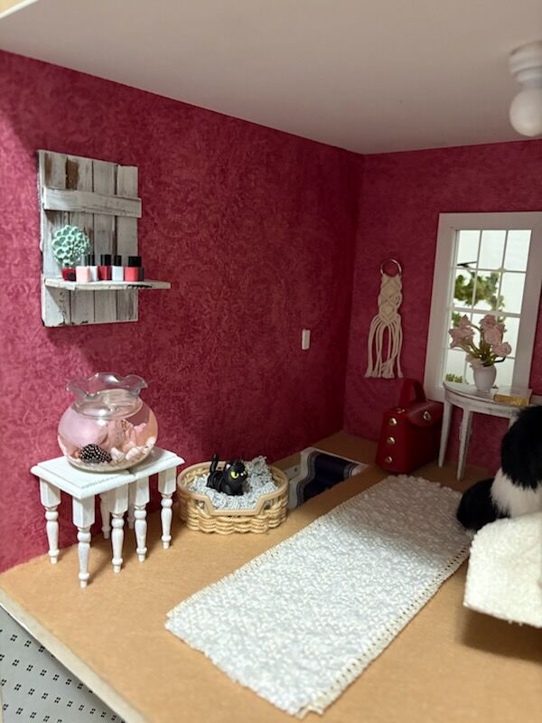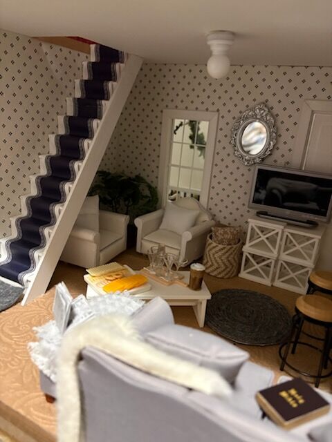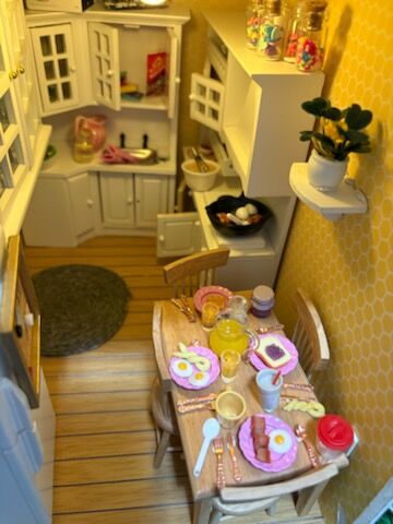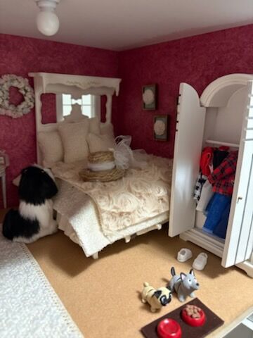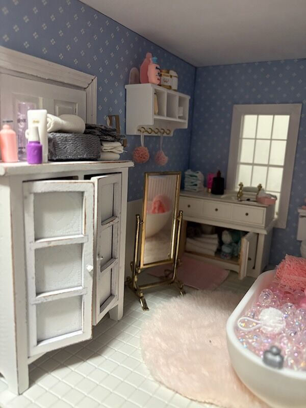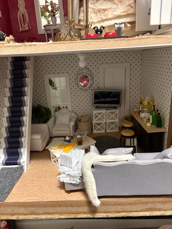 This beautiful hand-made dollhouse with all of the furnishings plus full yard is priced fairly at $600. If you know how to make miniatures, you know it is not easy or cheap to furnish a home. This beautiful home has two bedrooms, a craft/office start, yoga room, a family living area, kitchen fully stocked, bathroom ready for a bubble bath and a gorgeous yard to have a picnic-already sitting on grass. Animals welcome and included. An adorable BBQ, picnic table, and gardening table are included. It is 1:12 scale. You will have to pick it up in a truck or enclosed larger vehicle. There are 3 battery lights and decor is stuck down with putty so you can change the way each room looks. Made with tons of love in a smoke free and animal free home. You can remove all of the furniture and make it your own and have all of that extra stuff to redecorate. Bonus: NO HOA. I will wrap everything up including the hope chest and (holiday decor-not shown).