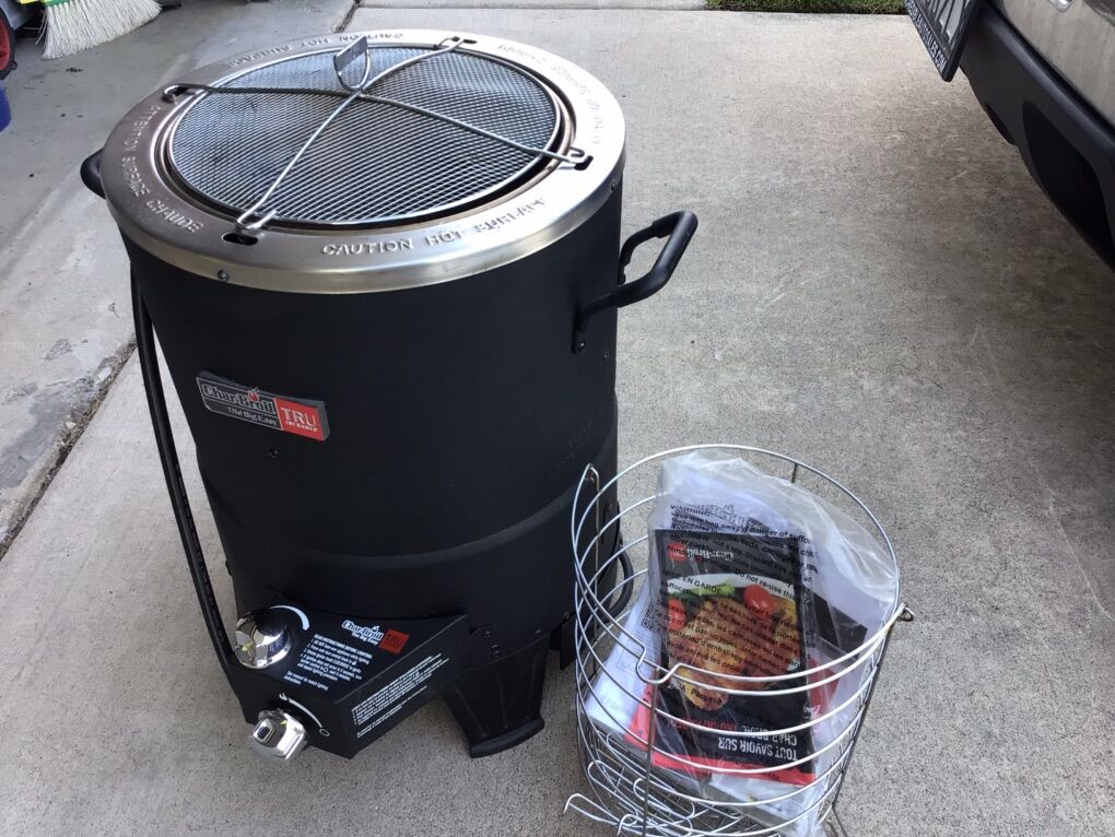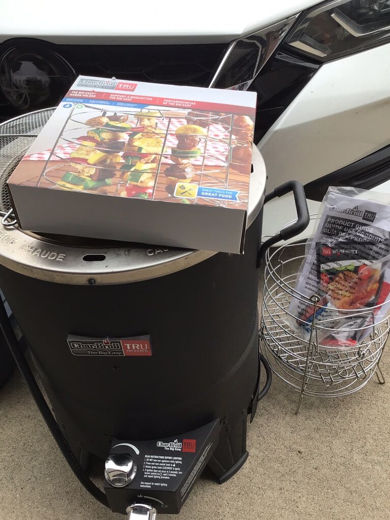 Charbroil Big easy tru infrared cooker with basket, rib hooks, skewers.