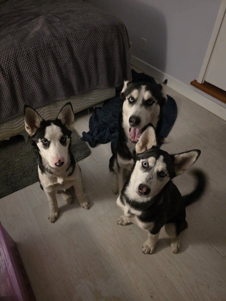 They are 5 months old really smart and super sweet. The white nosed dog is a snuggler and the freckled nose dog loves to imitate her mom and dad.