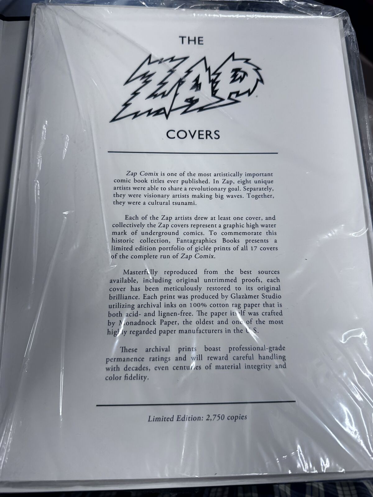 Also included exclusively in this boxed set is a portfolio of Zap covers by the eight artists, replicated from high resolution scans and proofs, and specially printed for this edition on acid-free, 100% cotton fine-art paper utilizing archival pigment inks.