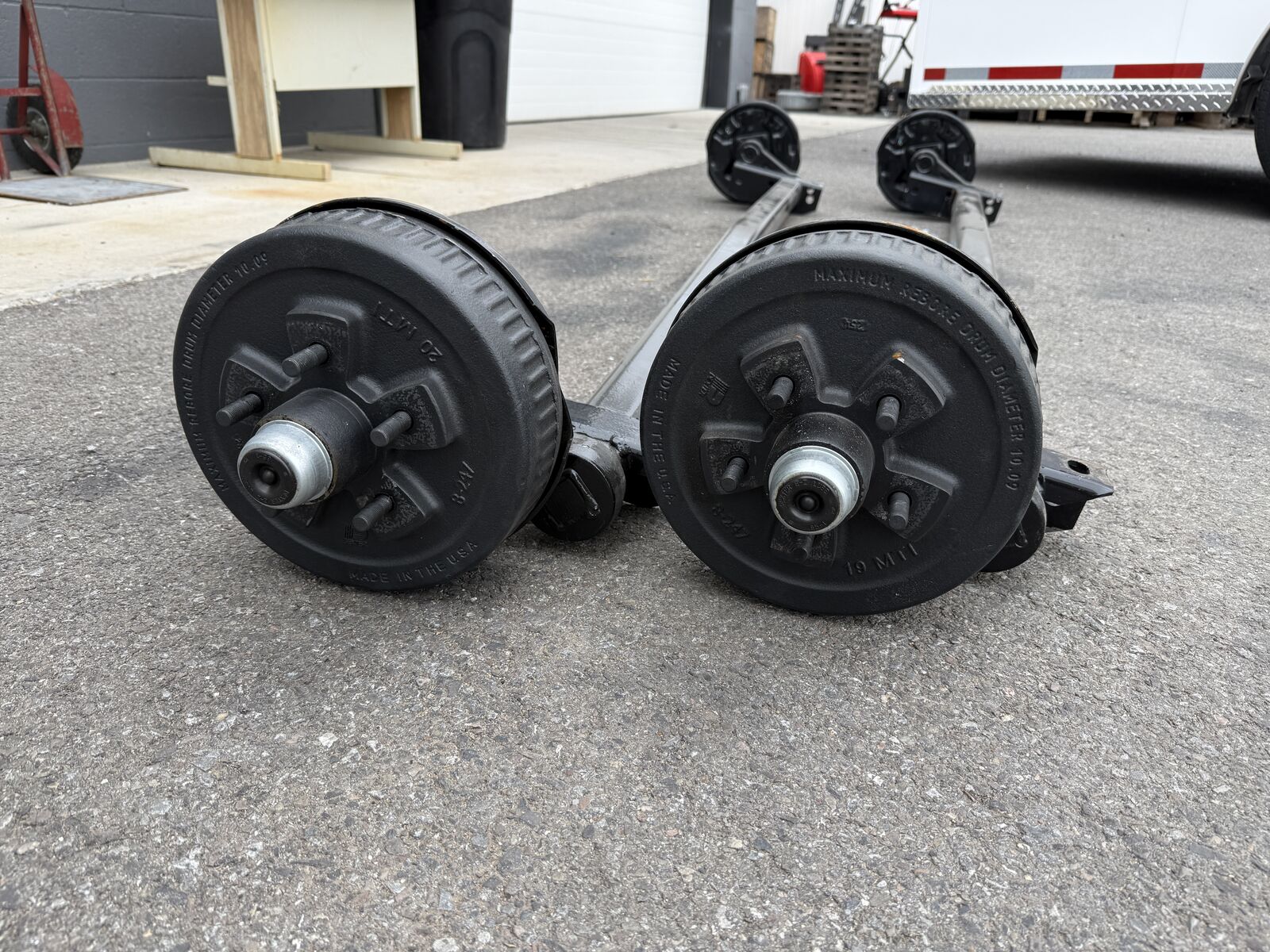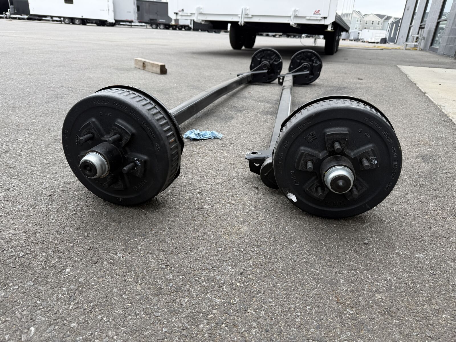 Brand new axles taken off a brand new trailer. These trailers have no miles on them ready to go. Fully assembled with electric brakes and drums. 5 lug with a bolt pattern of 5 on 4.5. Here are some dimensions: