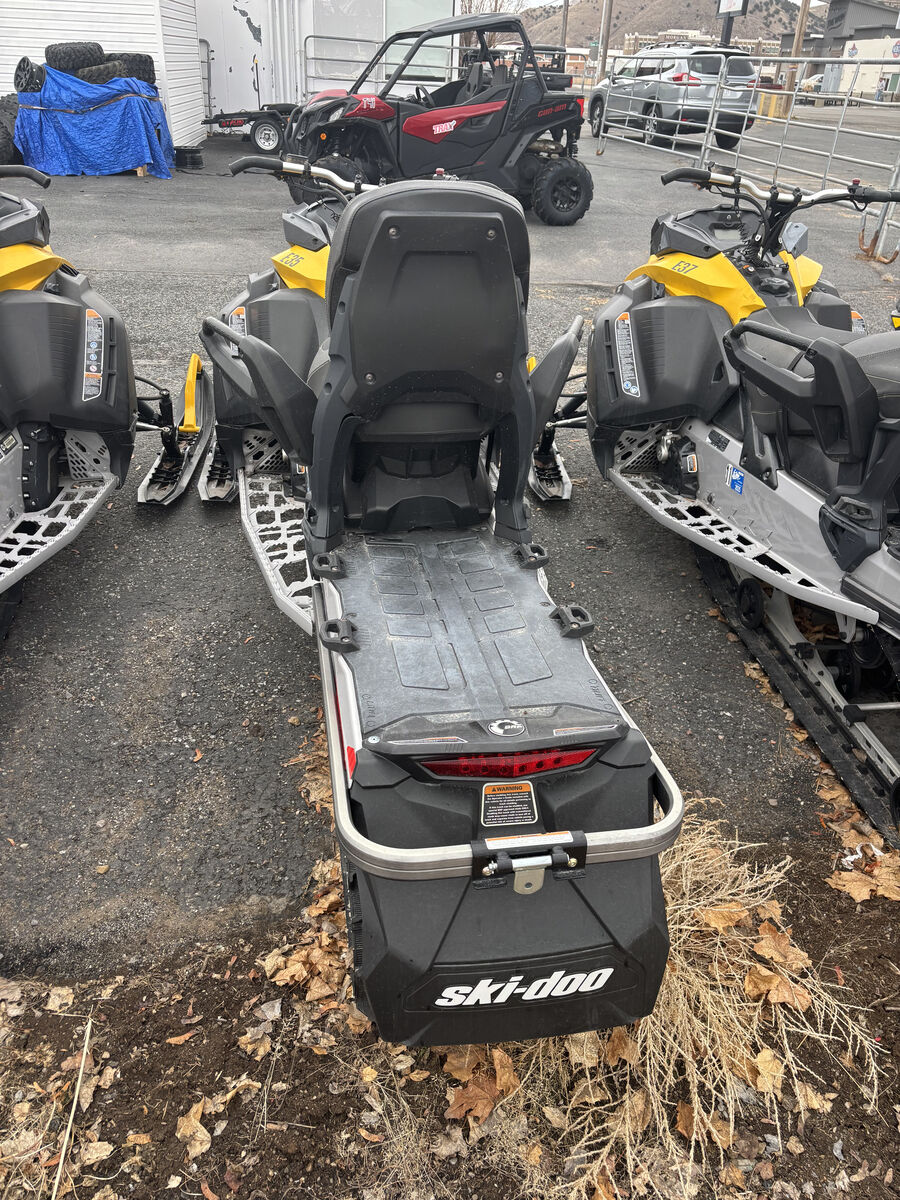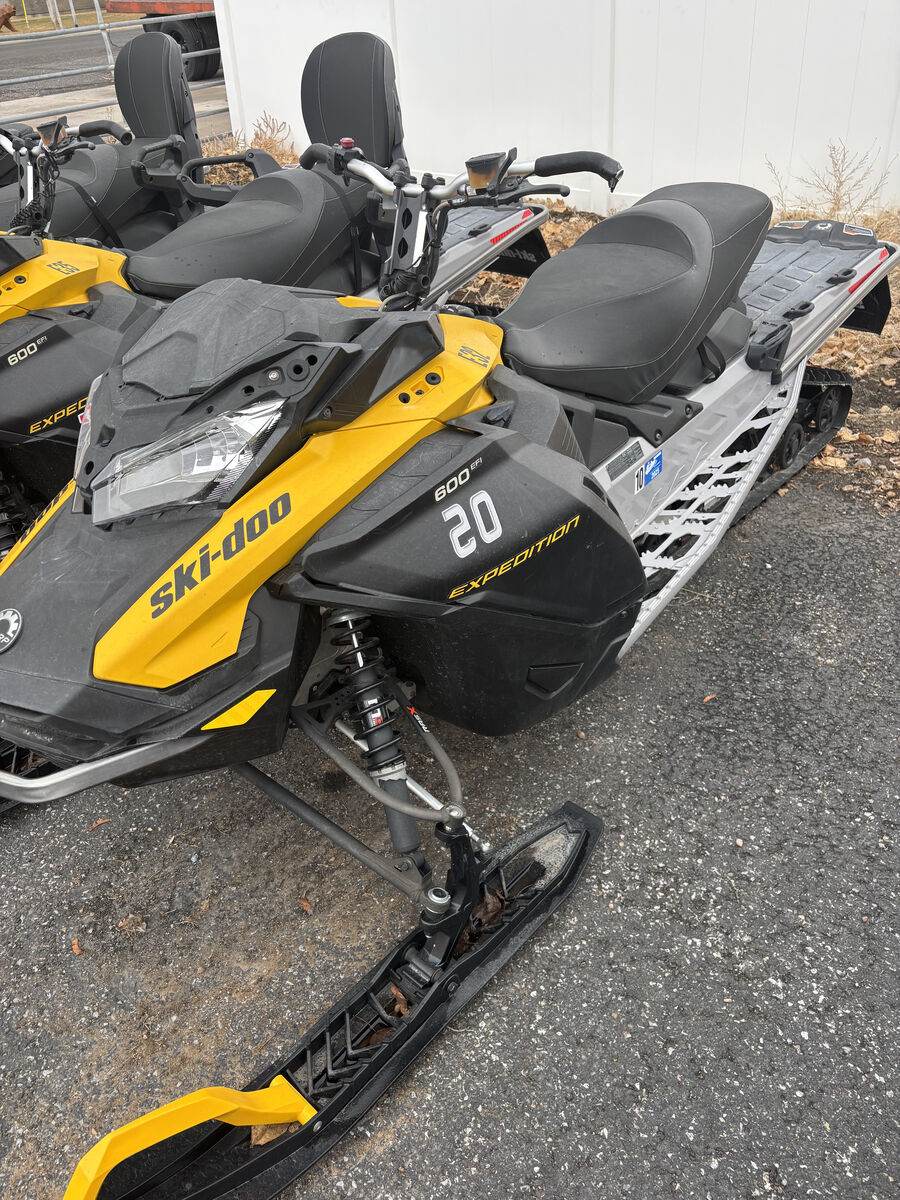 The 2023 Ski-Doo Expedition 600 two-seater is a versatile, REV Gen4-platform crossover sport-utility snowmobile designed for on/off-trail riding and work, featuring a standard 2-up modular seat with backrest. Available options include the 600R E-TEC (125 HP) in the LE trim or the 600 EFI (85 HP) in the Sport trim, offering 1.5-inch lug tracks for deep snow.