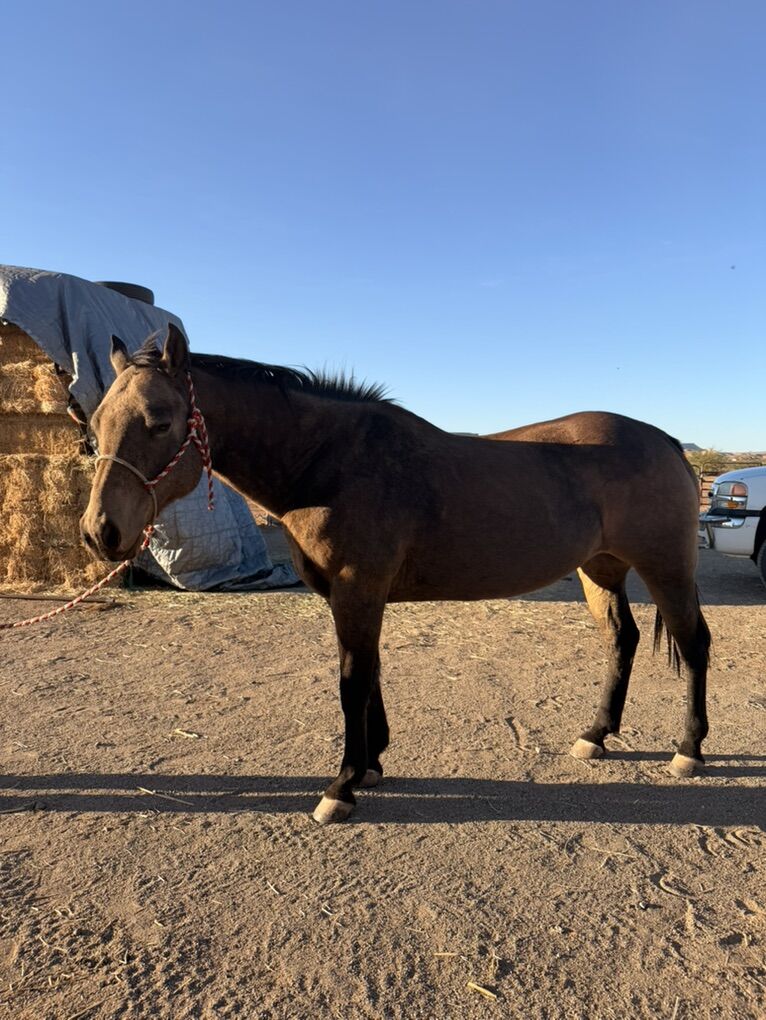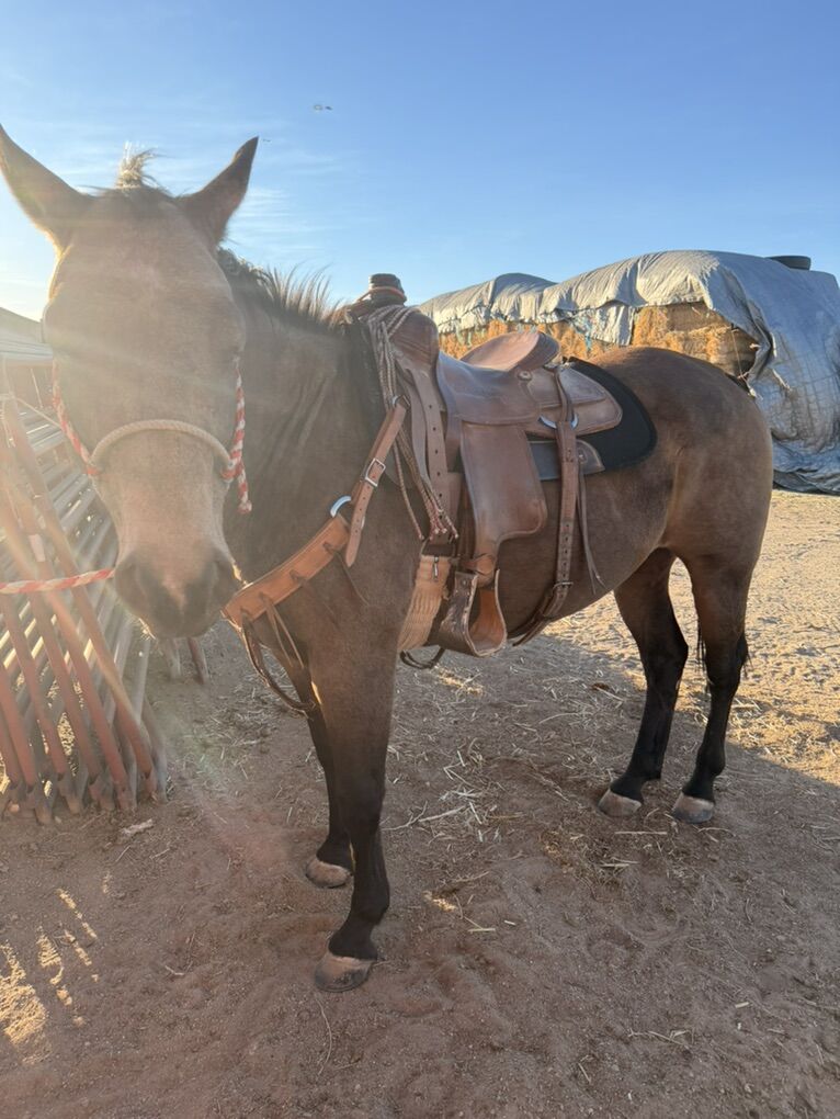 This is Buck don’t let his name fool you he doesn’t buck he’s a great horse he’s good to be around I used him to gather cows and he’s great with other horses and dogs. He’s good with farrier and loads great. I just recently started roping the dummy on him and the previous own stated they teamed roped on him. Not a beginner horse any other question shoot me a message