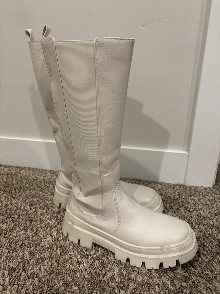 VenmoThese boots are really size 9 1/2 not nine, but they fit like a nine. They have a long zipper all the way to the bottom on one side and on the other side, a big elastic strip.
