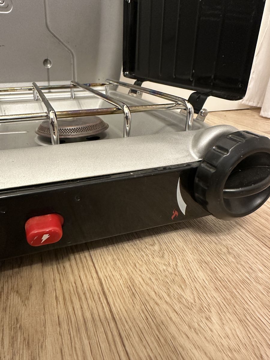 Instastart ignition lets you light the stove with the push of a button, no matches needed • Lasts up to 1.8 hours with both burners on high heat • PerfectFlow and PerfectHeat technology delivers consistent performance, even in extreme conditions, and uses less fuel for improved efficiency • Two adjustable burners that accommodate 12 and 10-in pans at the same time • WindBlock panels help protect burners from wind • 22,000 BTU of total cooking power • Durable chrome grate removes for easy cleaning; aluminized steel cooking surface resists rust