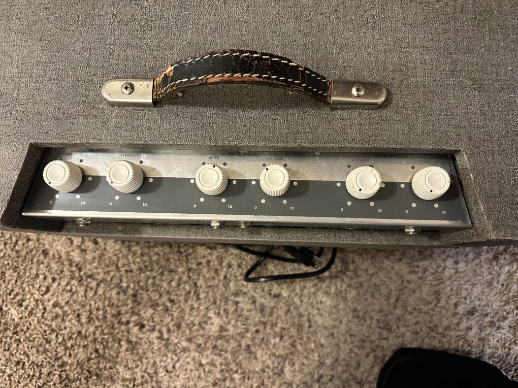 VenmoThe Silvertone Model 1432 10‑Watt 1x12 Guitar Combo is a rare, all-original 1960 Silvertone 1432 tube guitar amplifier that captures the warm, gritty charm of early ’60s vintage tone with its 10-watt output and single 12″ speaker. Built in the United States and sold through Sears (often manufactured by Danelectro), this compact combo features classic tube-driven circuitry with tremolo and simple control layout that delivers a rich, expressive voice perfect for blues, rockabilly, and classic rock sounds. With only necessary safety and reliability updates—such as replacement of capacitors and the electrical cord—while retaining its original electronics and aesthetic, this amp preserves its authentic vintage character and plays with the organic, responsive feel that collectors and players alike seek.