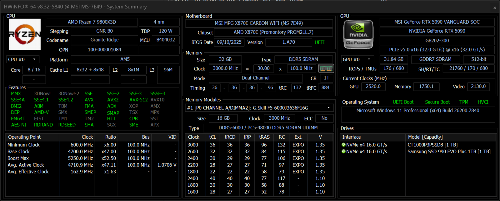ApplePayFull specs Desktop: Custom build GPU: MSI GeForce RTX 5090, 32GB (Vanguard edition) CPU: AMD Ryzen 7 9800X3D (8 cores / 16 threads) RAM: 32GB DDR5 Storage: 1TB Crucial P3 Plus NVMe 1TB Samsung 990 EVO Plus NVMe Motherboard: MSI MPG X870E Carbon WiFi Power supply: NZXT 1200W 80+ Gold Cooling: Gigabyte AORUS Waterforce X 360 (360mm AIO) Case: Lian Li O11 Dynamic EVO OS: Windows 11 Pro Condition: [Excellent]