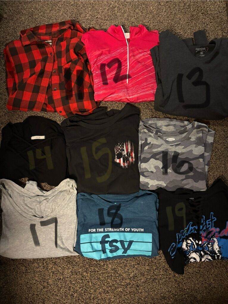 I have shirts that vary in size from small to large, and dresses that are small. All shirts $5 and dresses $15 except the pink two piece is $10 because of imperfections. Please message which number of clothing you are interested in. Located in Logan area