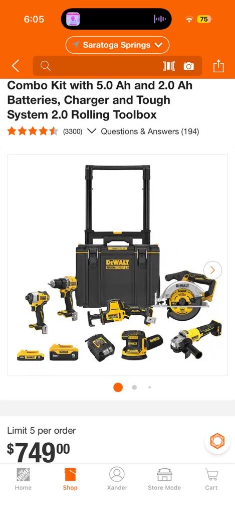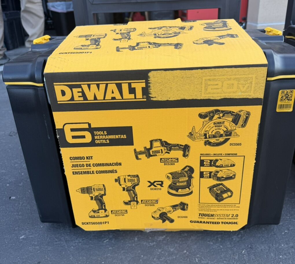This DEWALT 20-Volt MAX Brushless 6-tool combo kit includes one 1/2 in. drill/driver, 1/4 in. impact driver, 6-1/2 in. circular saw, 4-1/2 in. grinder, XR 5 in. random orbital sander , one 20-Volt MAX 5.0 Ah battery, one 20-Volt MAX 2.0 Ah compact battery, charger, and TOUGHSYSTEM 2.0 storage box.